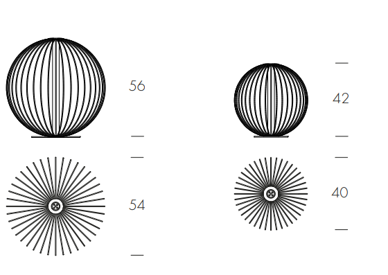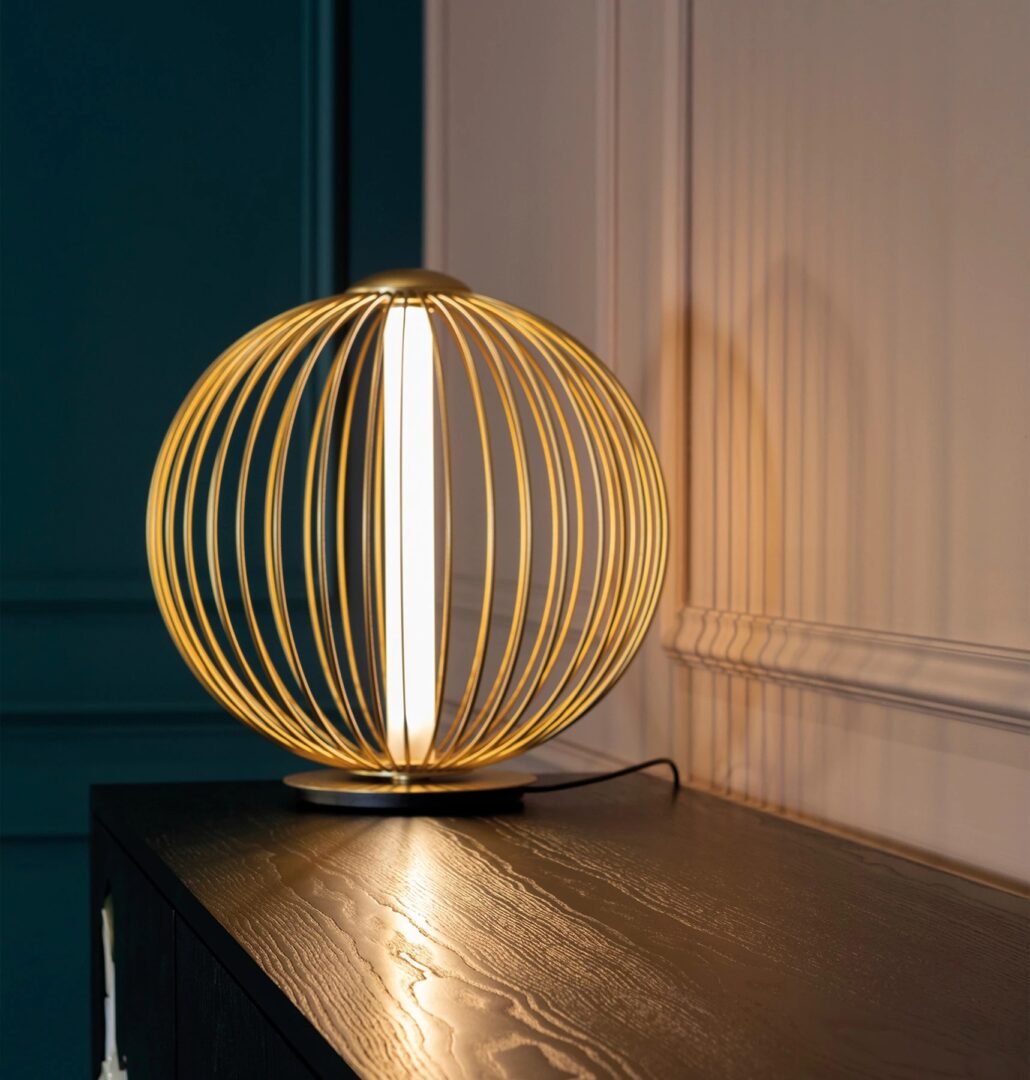 Лампа boule с светящейся трубкой в центре сфер, подвешенная на легкой металлической проволоке, также доступна в настольном варианте.