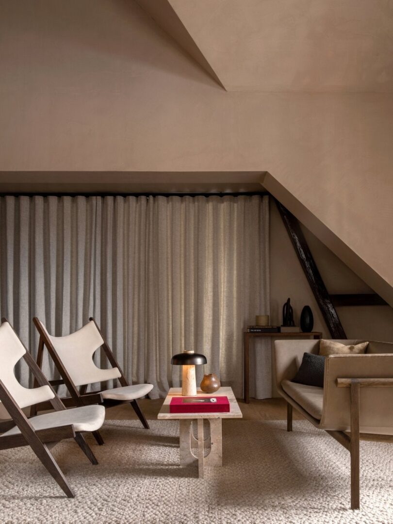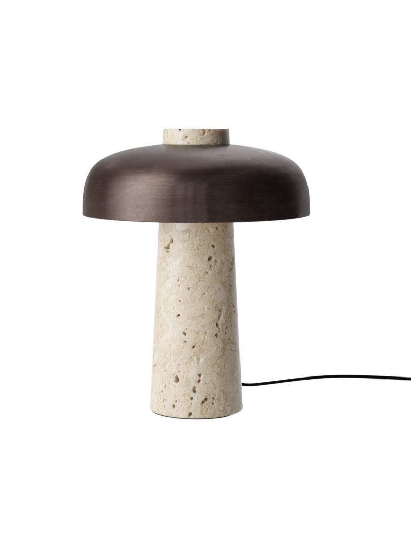 Вдохновленное игрой со структурой, созданной геометрическими ограничениями, коническое основание из травертина и изогнутый абажур из бронзированного алюминия придают светильнику идеально сбалансированный вид.