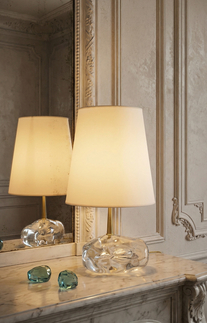 Лампа с массивным основанием из художественного стекла ручной работы и слегка отполированной латунью. Абажур shantung цвета слоновой кости имеет конусообразную форму.