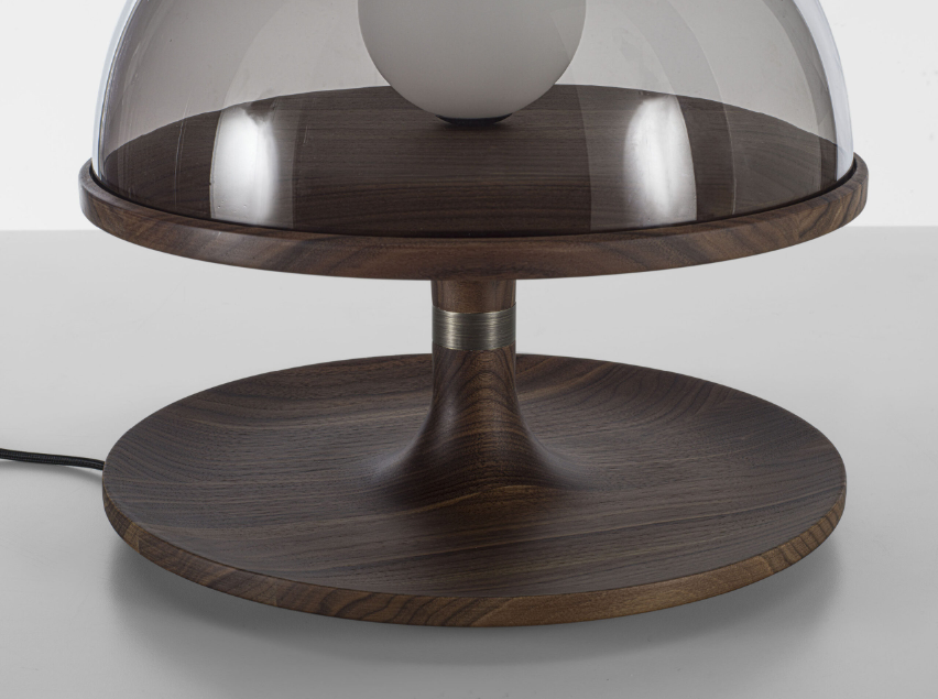 Настольная лампа Tack — это настольная лампа с мягкими и изящными линиями, для которых характерно чередование твердых поверхностей и пустот. Конструкция состоит из подставки для хранения, выполняющей функцию подноса, и ножки из массива ореха каналетта. Соединительные элементы превращаются в декоративные детали из металла с матовой бронзовой отделкой из латуни.