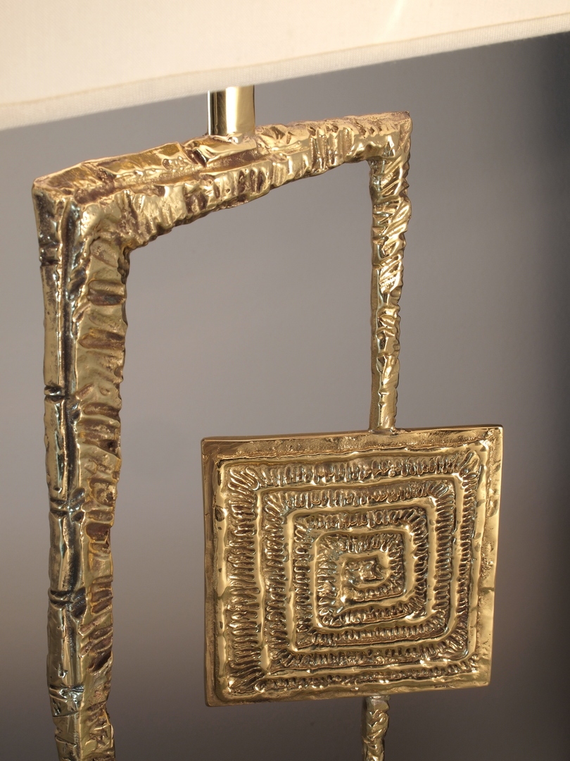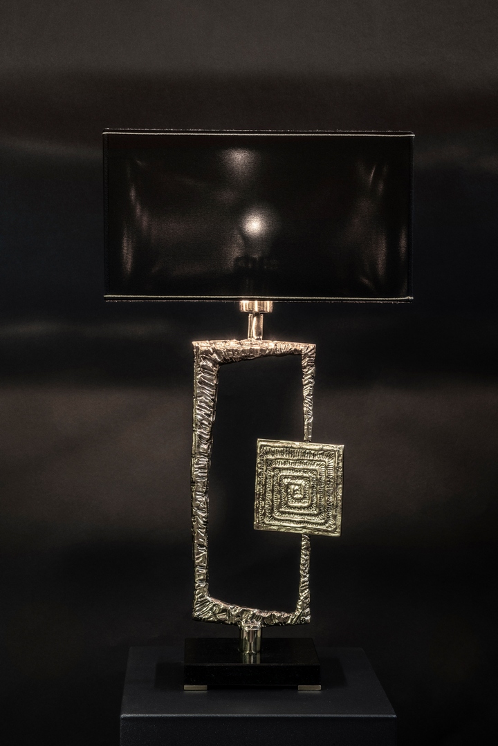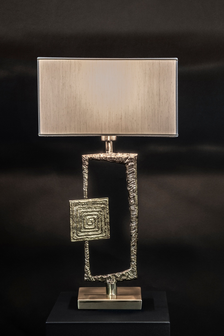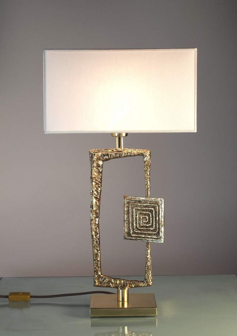 Настольная лампа с основанием из латуни или черного мрамора, корпусом из полированной литой латуни, прямоугольным абажуром из слоновой кости или черного шантунга с позолотой внутри.