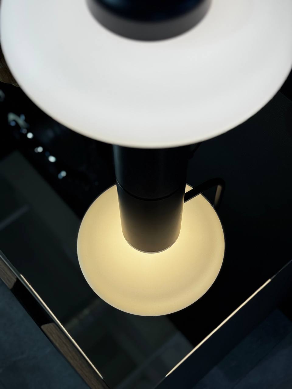 Настольная лампа с регулируемой яркостью света. Рассеиватель из опалового стекла. Металлическая конструкция с матовым покрытием.