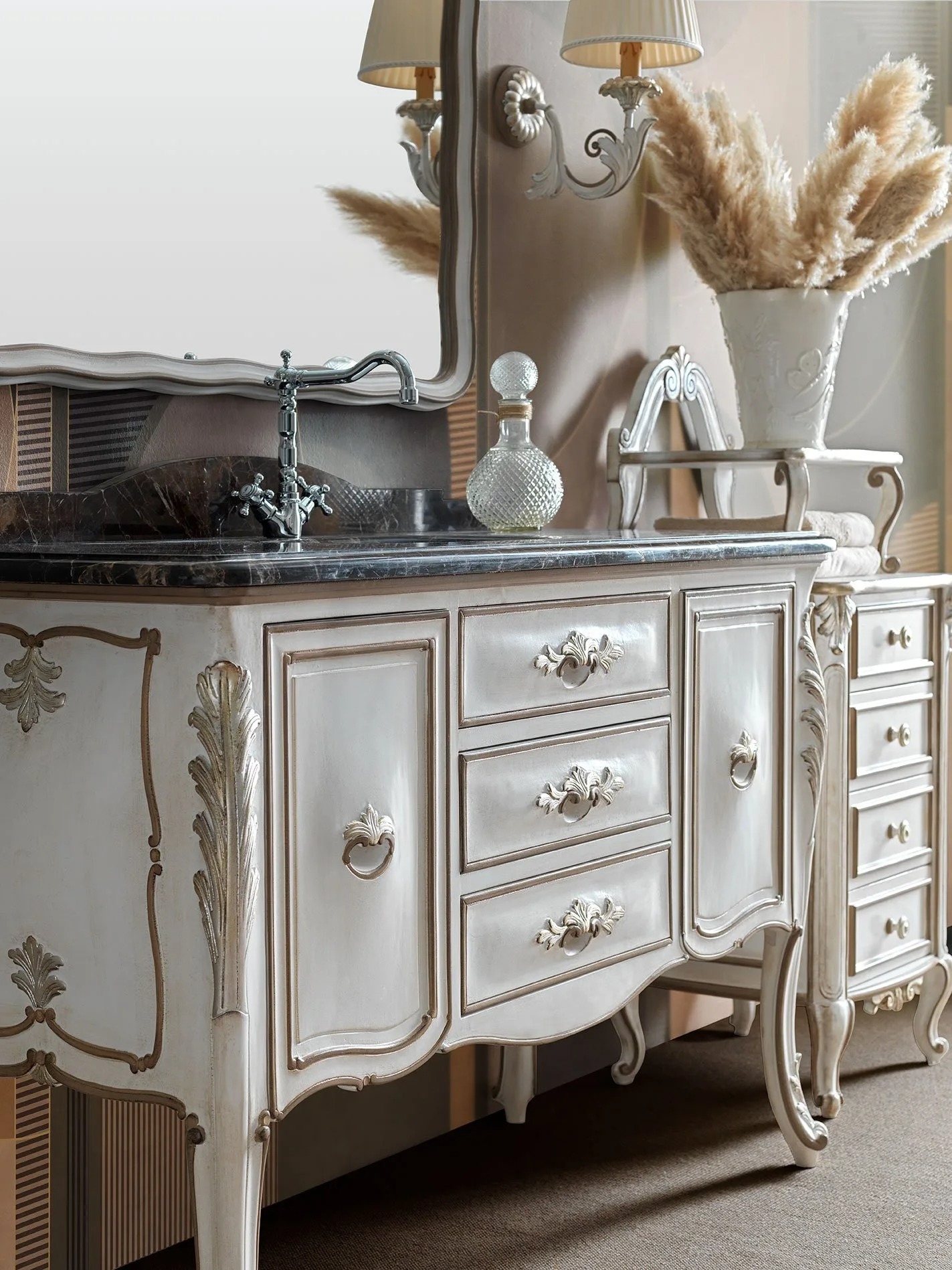 Шкаф для ванной комнаты с ящиками и дверцами, столешница из коричневого мрамора Emperador Dark, цвет отделки античный белый, табак и серебристый, отделка класса B