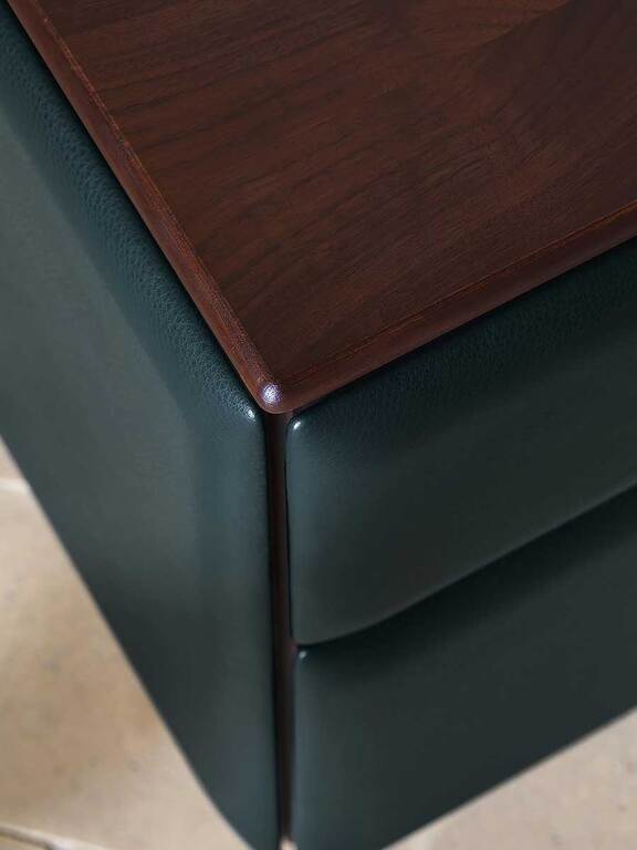 Каждый аксессуар Moondance обит вручную, как уникальный предмет. Он полностью обтянут кожей Pelle Frau® и украшен легкой обивкой, приятной на ощупь и привлекающей внимание. Столешница выполнена из теплого ореха Каналетто и украшена натуральными прожилками мрамора Calacatta gold с полуполированной отделкой. Каждый выдвижной ящик можно расположить по своему вкусу, выбрав из изысканных аксессуаров, которые дополняют коллекцию Moondance. Серия лотков из цельного дерева, разделенных на отделения различных размеров и конфигураций, позволяет удобно хранить любые предметы, включая галстуки и ремни