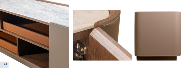 Каркас из МДФ с отделкой шпоном грецкого ореха, двери с отделкой из синтетической кожи; столешница из композитной керамики. Размеры 220x40x44 см