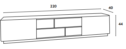 ТВ-тумба имеет размеры 220 × 40 × 44 см (ширина × глубина × высота).