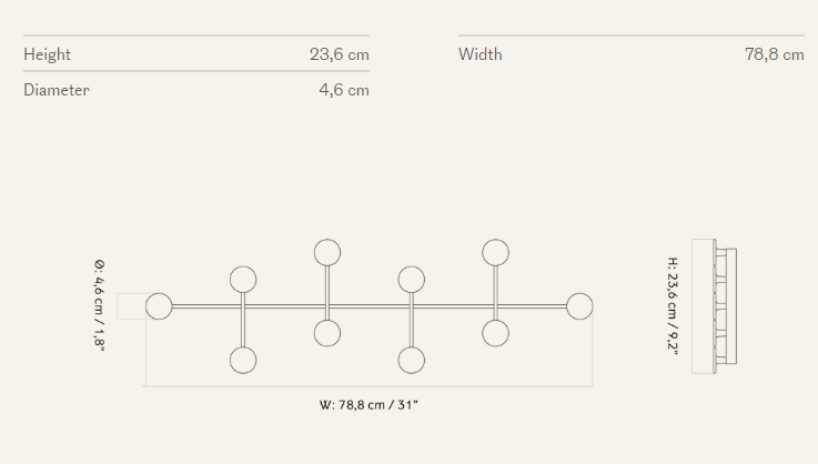 Вешалка для одежды Afteroom. Круглые «точки» из металла с порошковым покрытием, которые легко крепятся к стене с помощью скрытых шурупов, подчеркивающих его чистую эстетику, позволяют вешать одежду, сумки и многое другое в прихожей или спальне. Его можно вешать как горизонтально, так и вертикально, украшая пустые стены в любом помещении, превращая их из простых полотен в произведения искусства.