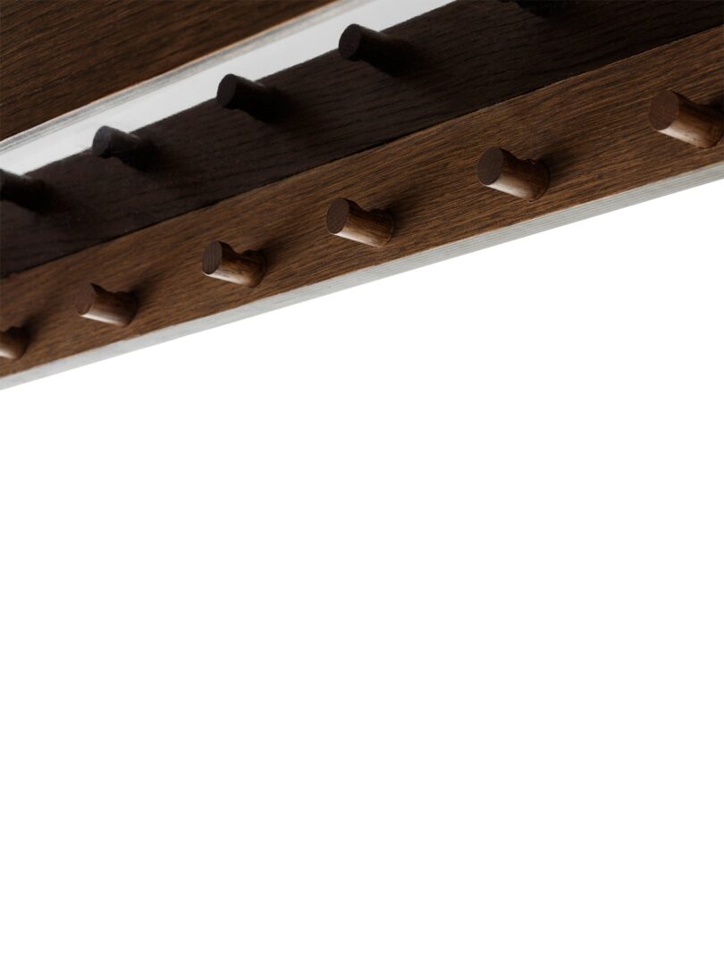 Многофункциональная, компактная полка-вешалка Epoch со стойкой, как следует из ее названия, представляет собой одновременно полку и подвесную рейку в одном исполнении. В дизайне, выполненном из дубового шпона, гнутого паром, с натуральным покрытием или с темным тонированием, скрыты 11 деревянных крючков для развешивания одежды, сумок и аксессуаров в прихожей, спальне или ванной комнате.