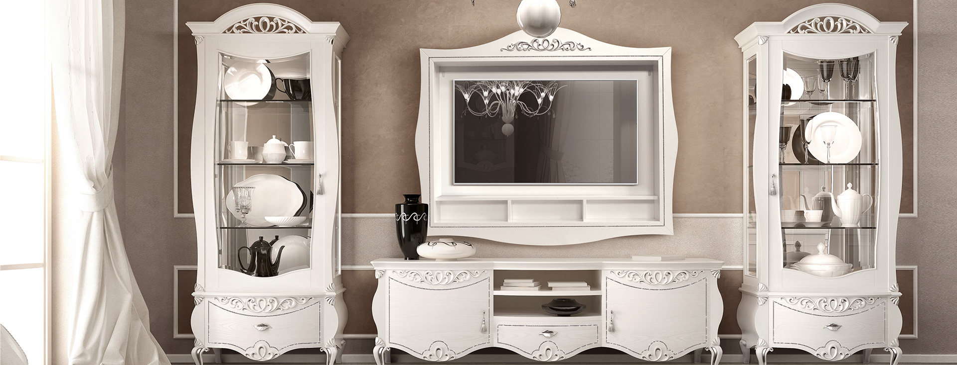 Витрина имеет большое прозрачное стекло по бокам. Ее основные части – столешница и основание — имеют декоративные вставки. Оснащенная точечными светильниками, зеркальной спинкой и хрустальными полками, она украшена тонкими линиями Swarowsky. Элегантный и изысканный элемент, он создает романтическую и уютную атмосферу. Также доступен в однодверном исполнении с лакированной отделкой цвета слоновой кости и золотыми деталями.