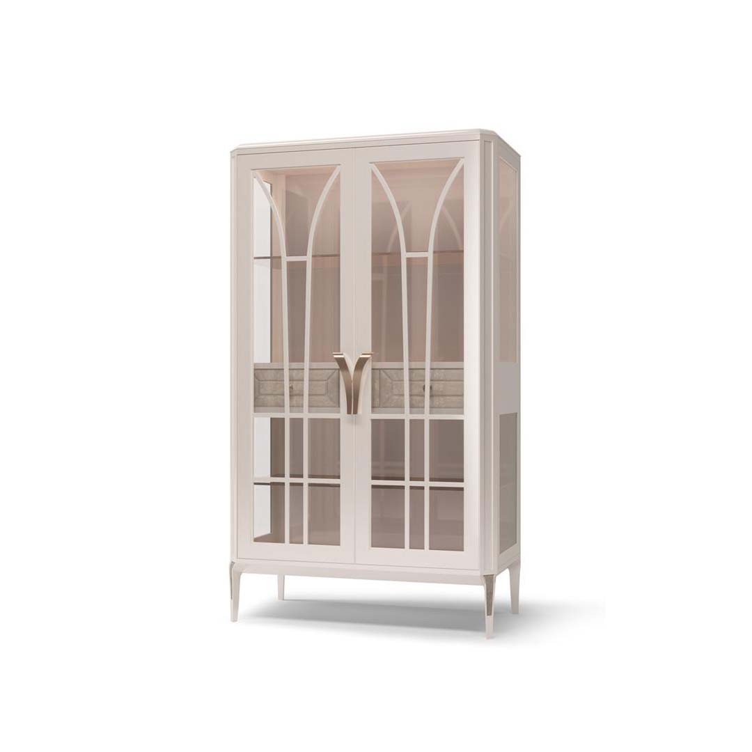 Дополнительные детали подчеркивают премиальность: внутренние ящики с кожаной отделкой, бронзовая зеркальная спинка и хрустальные полки. Доступна в одно- и двухдверной версиях, что позволяет идеально вписать витрину в интерьер любого стиля.