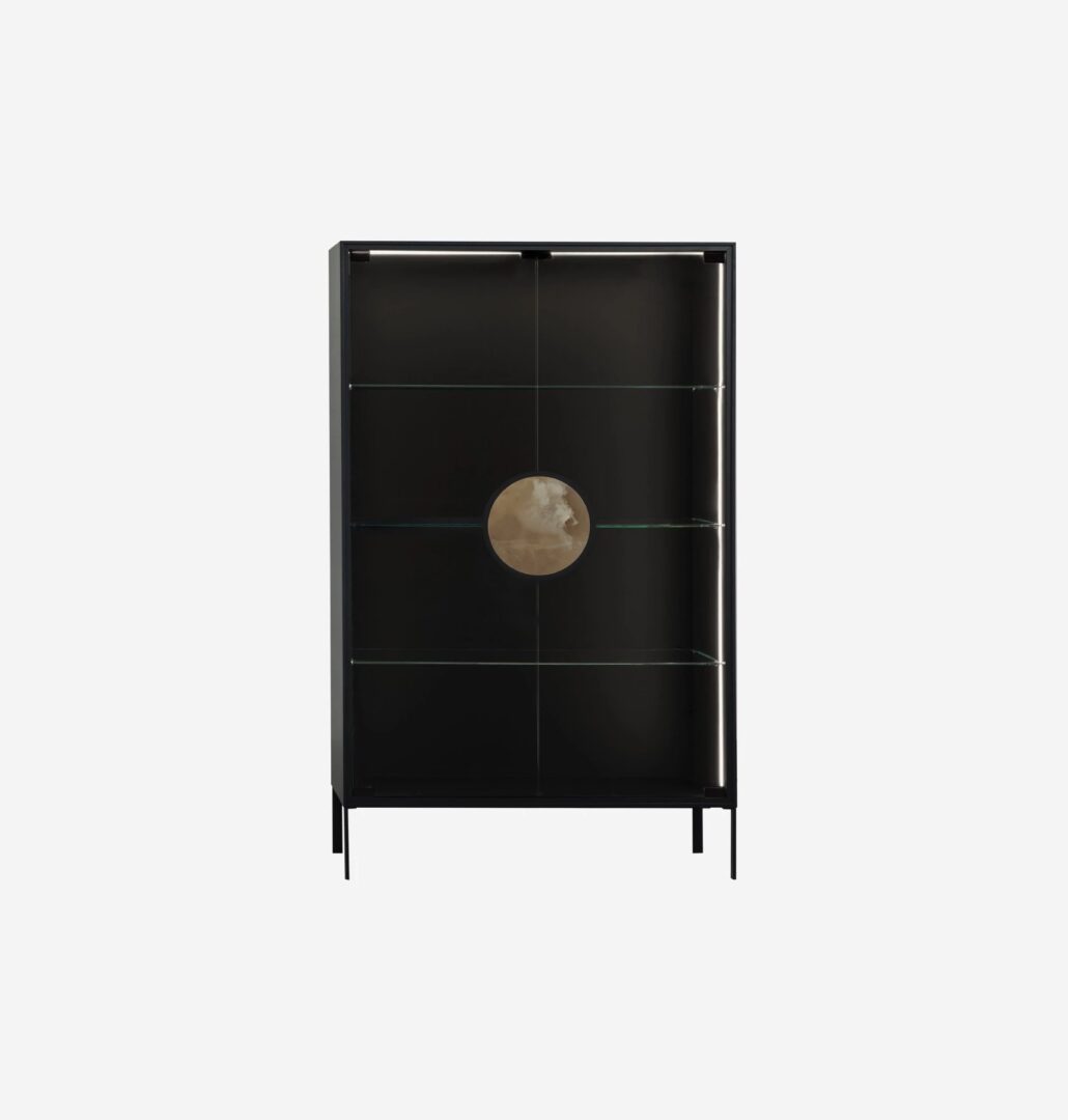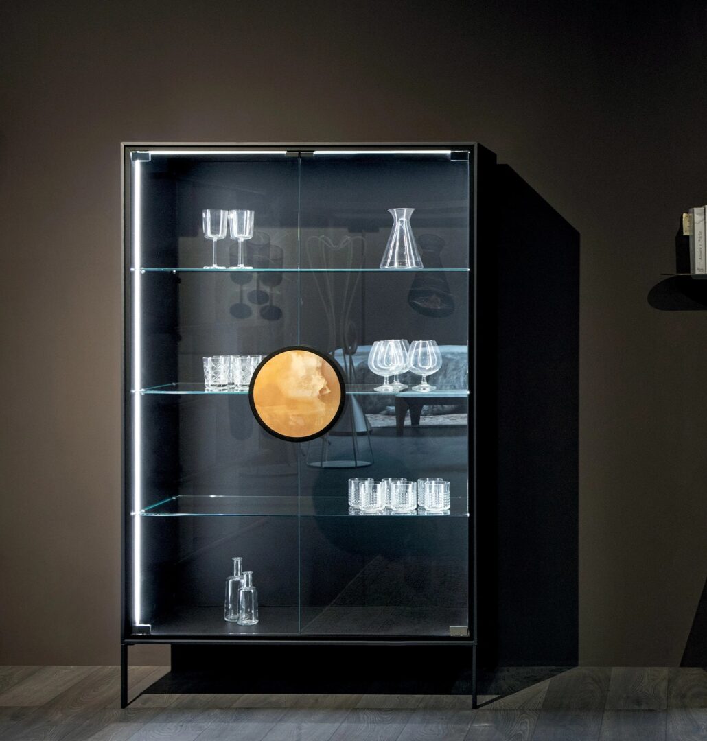 Dot-это минималистичная шикарная витрина с легкой формой и решительным характером, элегантным дизайном и ценными деталями: идеальный круг, который служит деревянной или керамогранитной ручкой, подчеркивает эстетику прозрачных или дымчатых хрустальных дверей.
