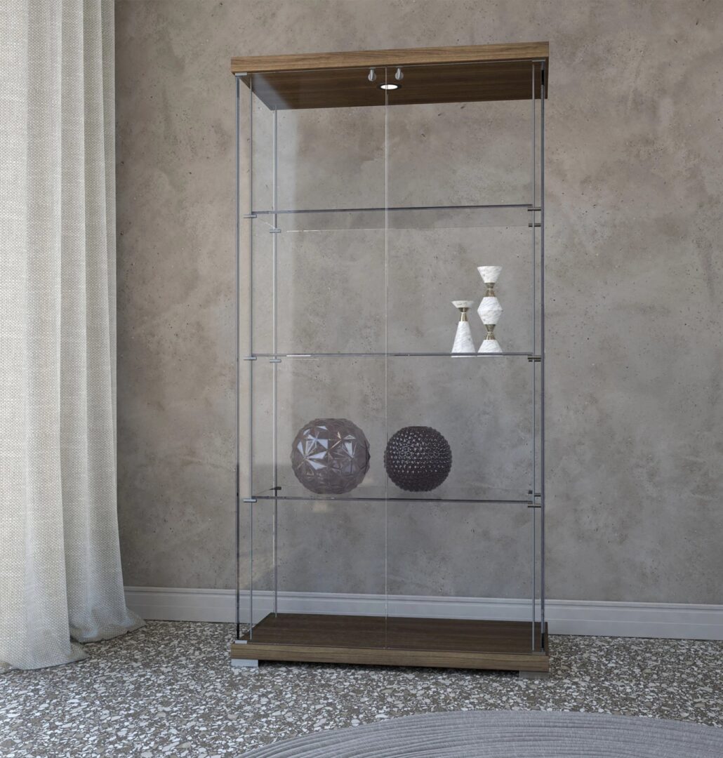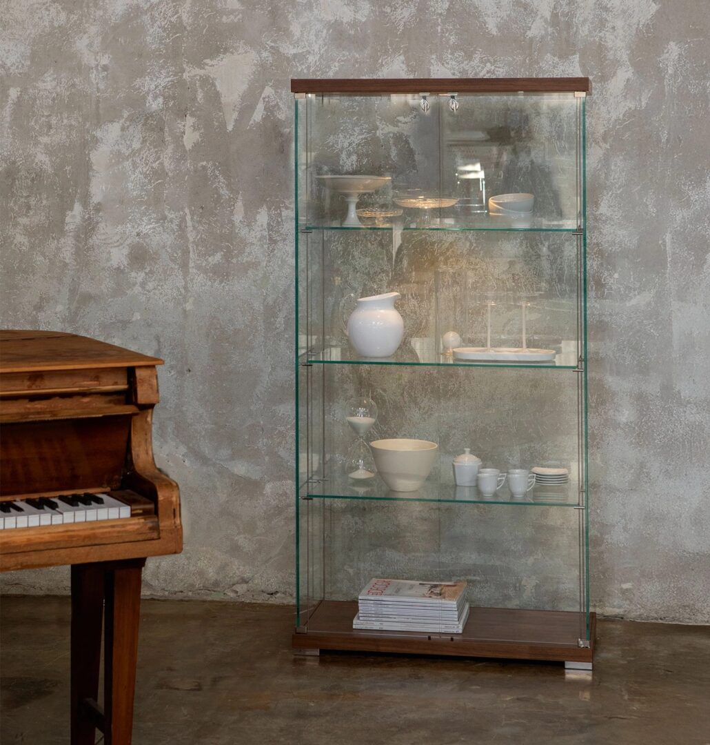 Элегантная витрина с деревянным основанием и верхом, структурой и полками из прозрачного хрусталя. Ego plus — это предмет мебели в изысканном стиле, украшенный внутренним светодиодным светом, который подчеркивает сдержанный декор.