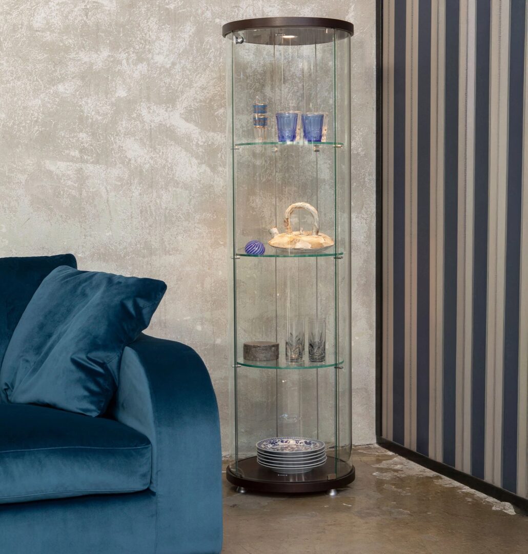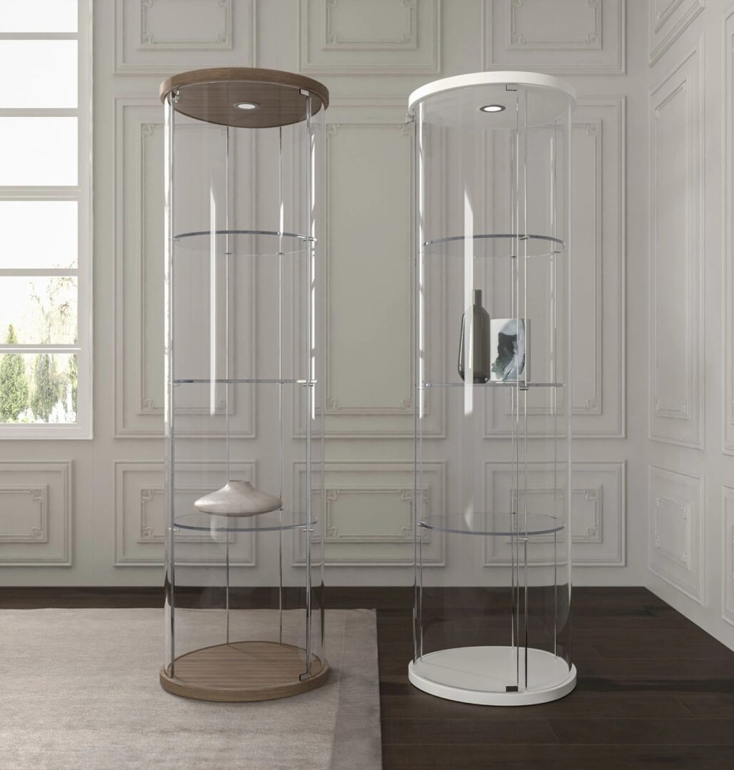 Элегантная витрина округлой формы с деревянным основанием и верхом, структурой и полками из прозрачного хрусталя. Ego round — это предмет мебели в изысканном стиле, украшенный внутренним светодиодным светом, который подчеркивает сдержанный декор.