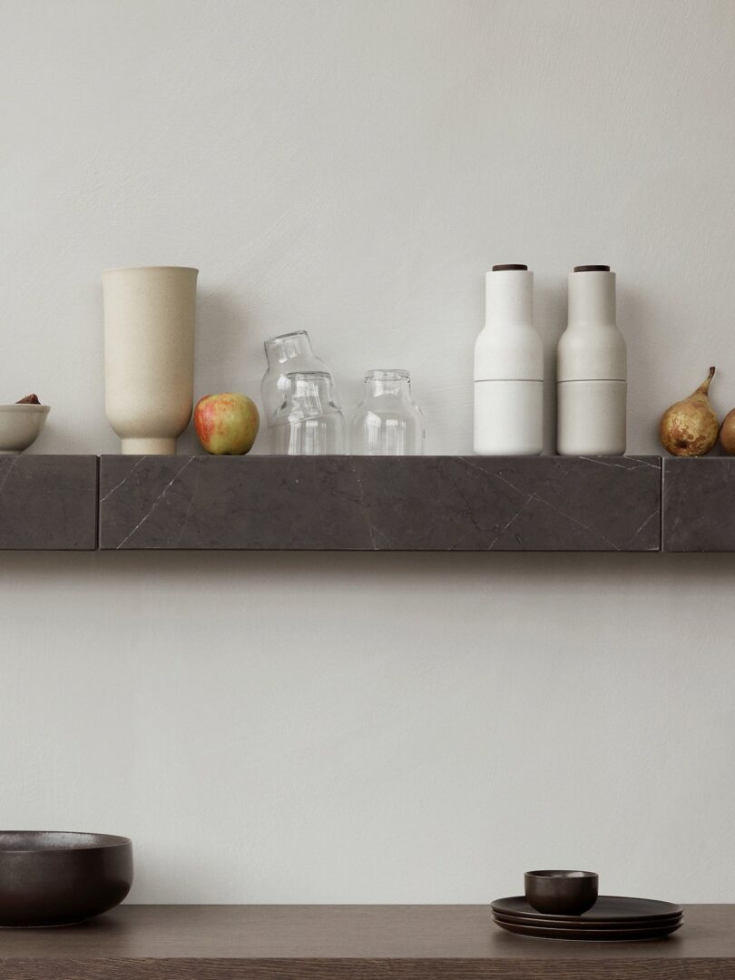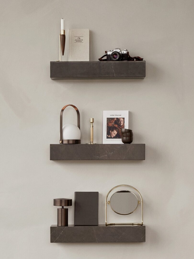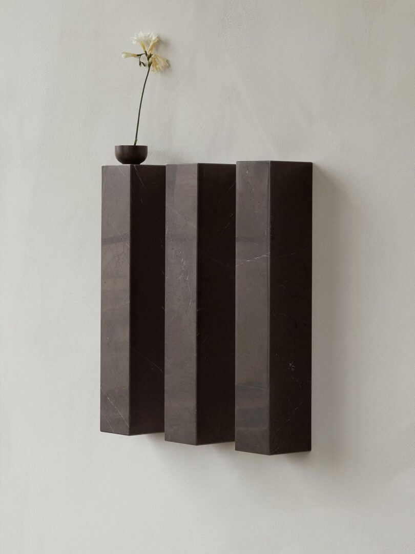 Минималистичный профиль цокольной полки выполнен из серого мрамора. Шлифованный мрамор и камень придают изысканность и элегантность любому помещению. Элегантная и целеустремленная полка длиной 60 см может быть прикреплена к стене горизонтально для использования в качестве витрины или книжной полки или вертикально в качестве настенного подиума, на котором можно продемонстрировать понравившийся предмет.