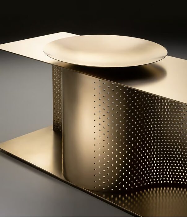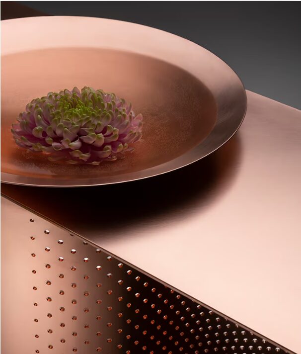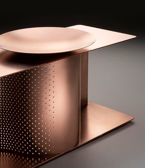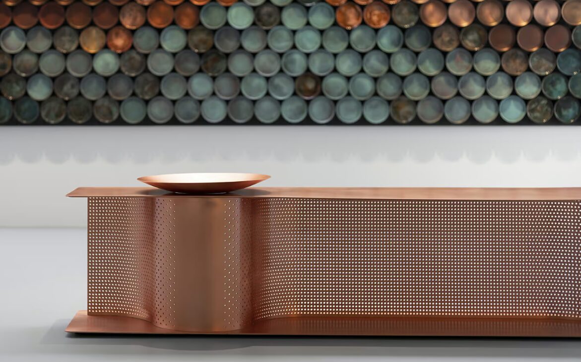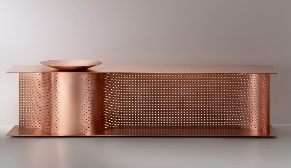 Вертикальная волнообразная стенка из перфорированного металлического листа придает легкость объему и утонченность скульптурной форме