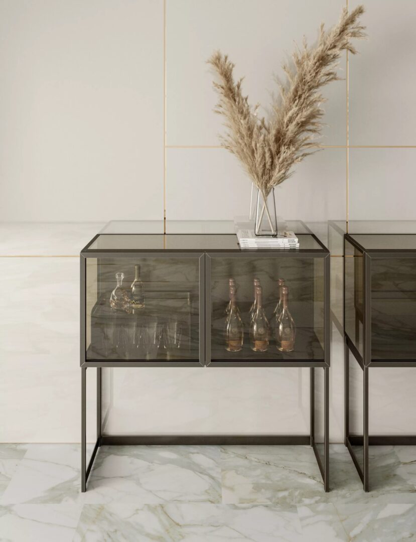 Бар с каркасом из стали и алюминия, окрашенным в темный латунный цвет, распашными дверцами, боковинами и верхней стеклянной поверхностью бронзового цвета. Нижний каркас тележки из стального каркаса, окрашенного в темный латунный цвет