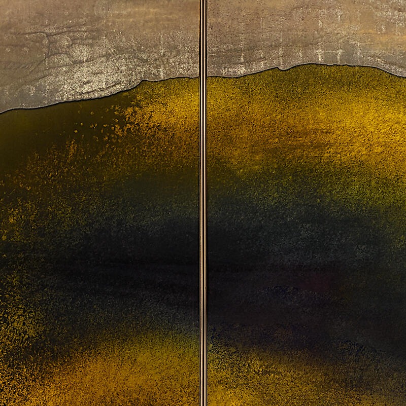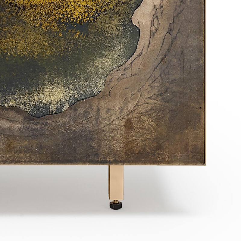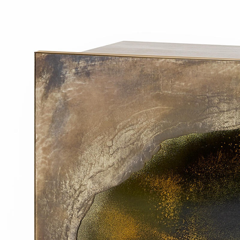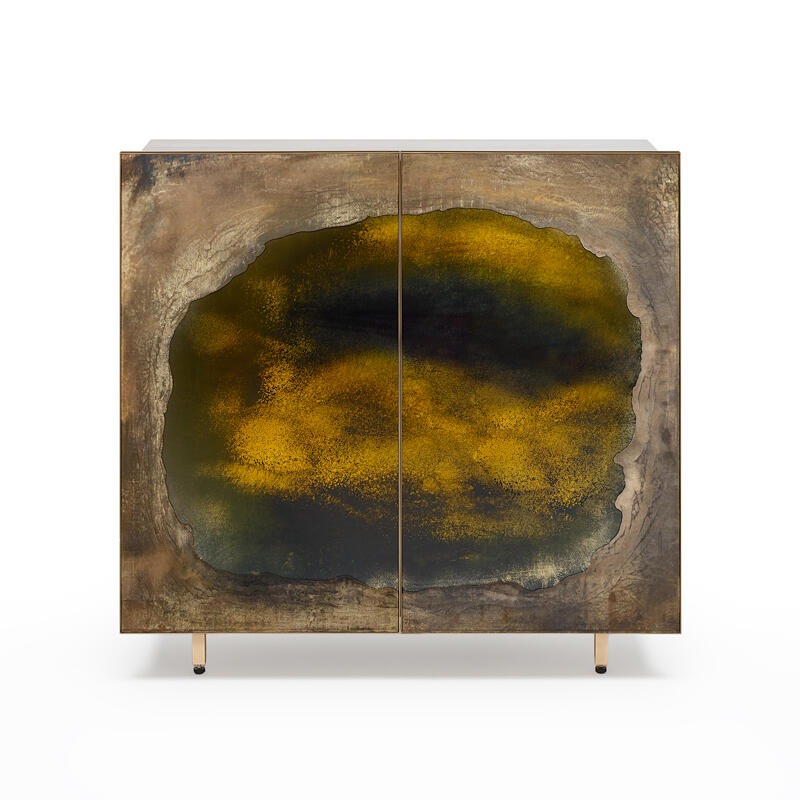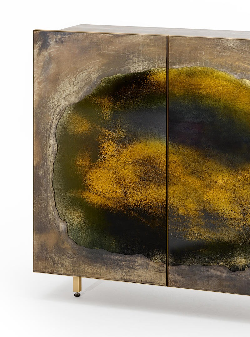 Покрытая лаком и матовым шпоном ясеня фанерная конструкция. Две двери из особо прозрачного стекла, украшенные отделкой Limides.