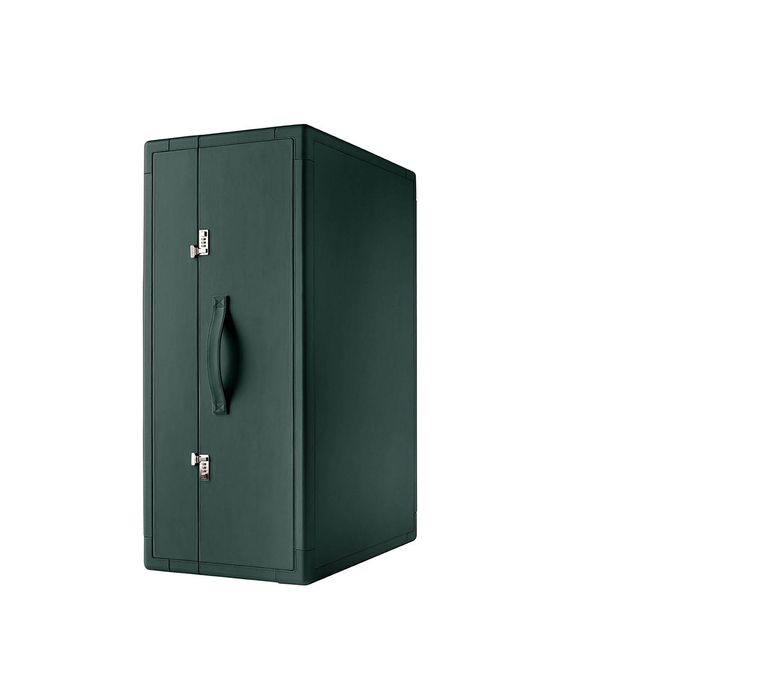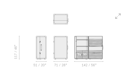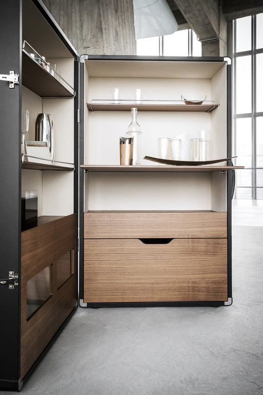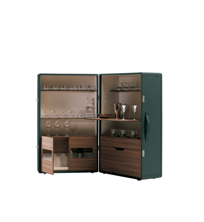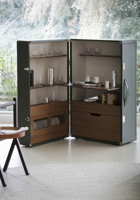 Конструкция мобильного бара Isidoro выполнена из панелей из тополиной фанеры. Внешняя обивка выполнена из натуральной кожи, а внутренние стенки элегантно декорированы холстом. Полки и выдвижные ящики выполнены из тополиной фанеры и облицованы ореховым шпоном Canaletto. Отделения для стаканов и бутылок дополнены миниатюрными металлическими перилами с хромированным покрытием. Ножки изготовлены из пластика: неподвижная часть снабжена крышками, а открывающаяся — поворотными колесиками. Пара комбинированных механизмов click-to-close обеспечивают идеальное закрывание шкафа.