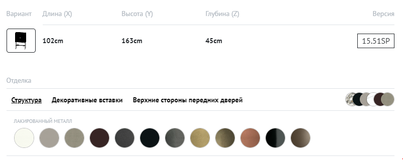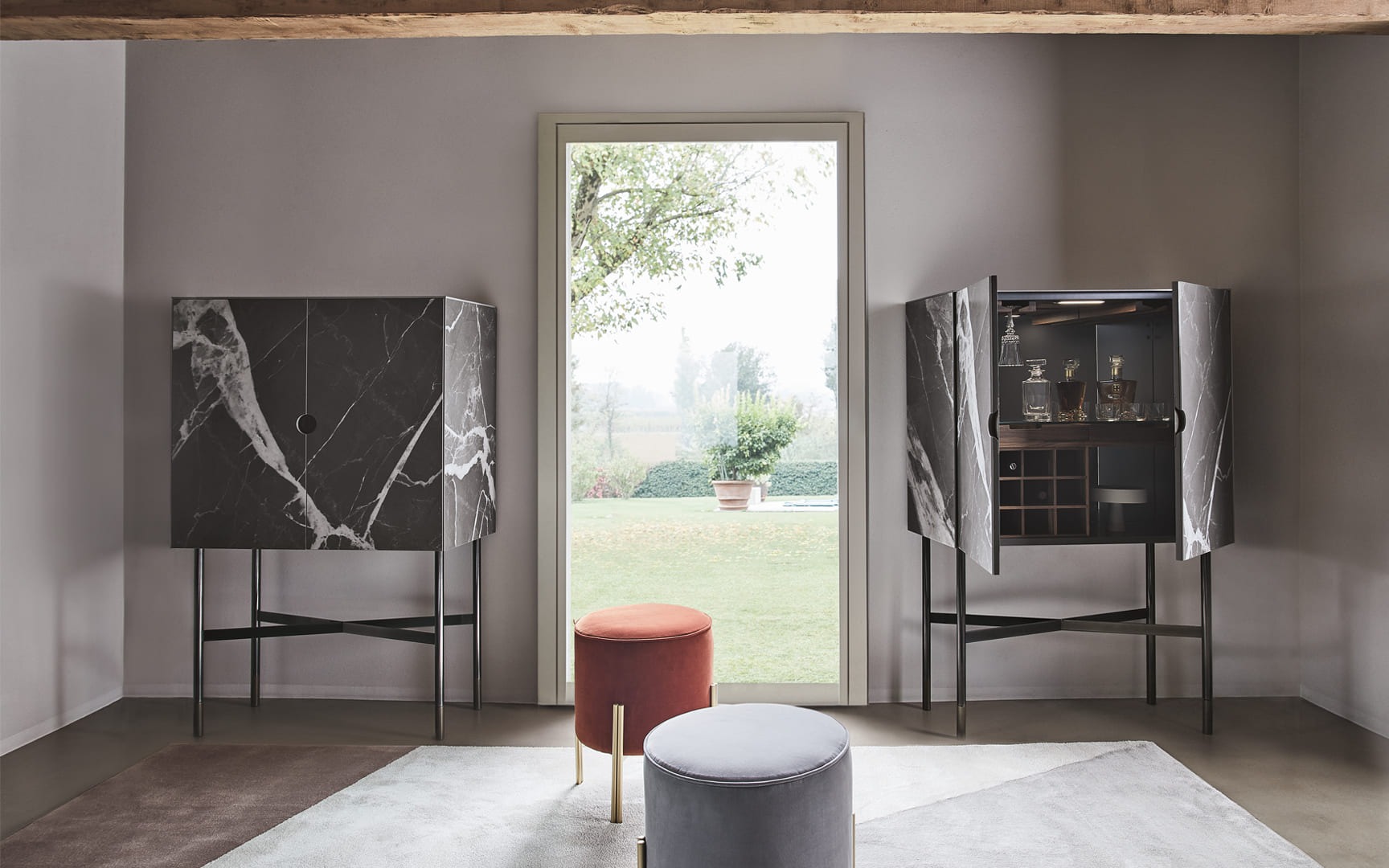 Бар, структурa из дерева, две распашной дверки, внутренняя полка из прозрачного стекла, зеркальная задняя внутренняя стенка, внутренние ящики, oтсек для хранения бутылок и подвесной держатель для бокалов из массива ореха Каналетто. Столешница, боковины и дверцы из стекла или СуперМрамора. Структура, декоративные ножки и ручки из лакированной стали.