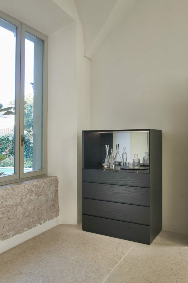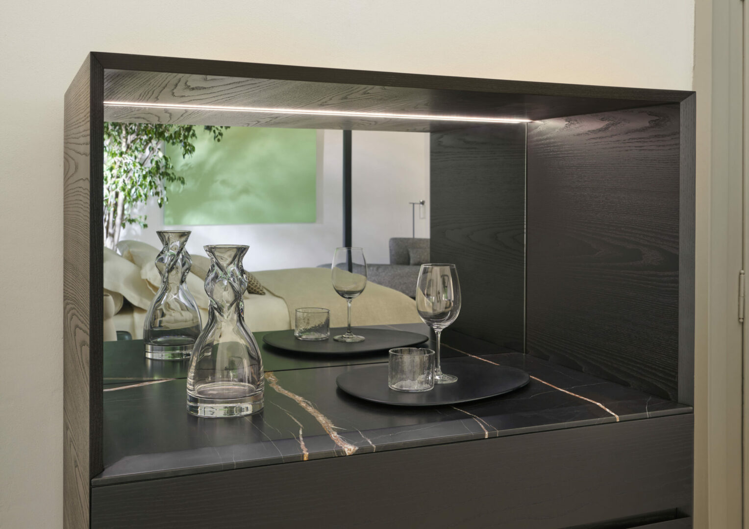 Элегантный бар Manhattan, вдохновленный архитектурным очарованием небоскребов в одноименном районе Нью-Йорка, может похвастаться внушительной конструкцией, полностью выполненной из массива дерева и дополненной пазами, которые обеспечивают безупречный доступ к выдвижным ящикам под углом 45 градусов.
