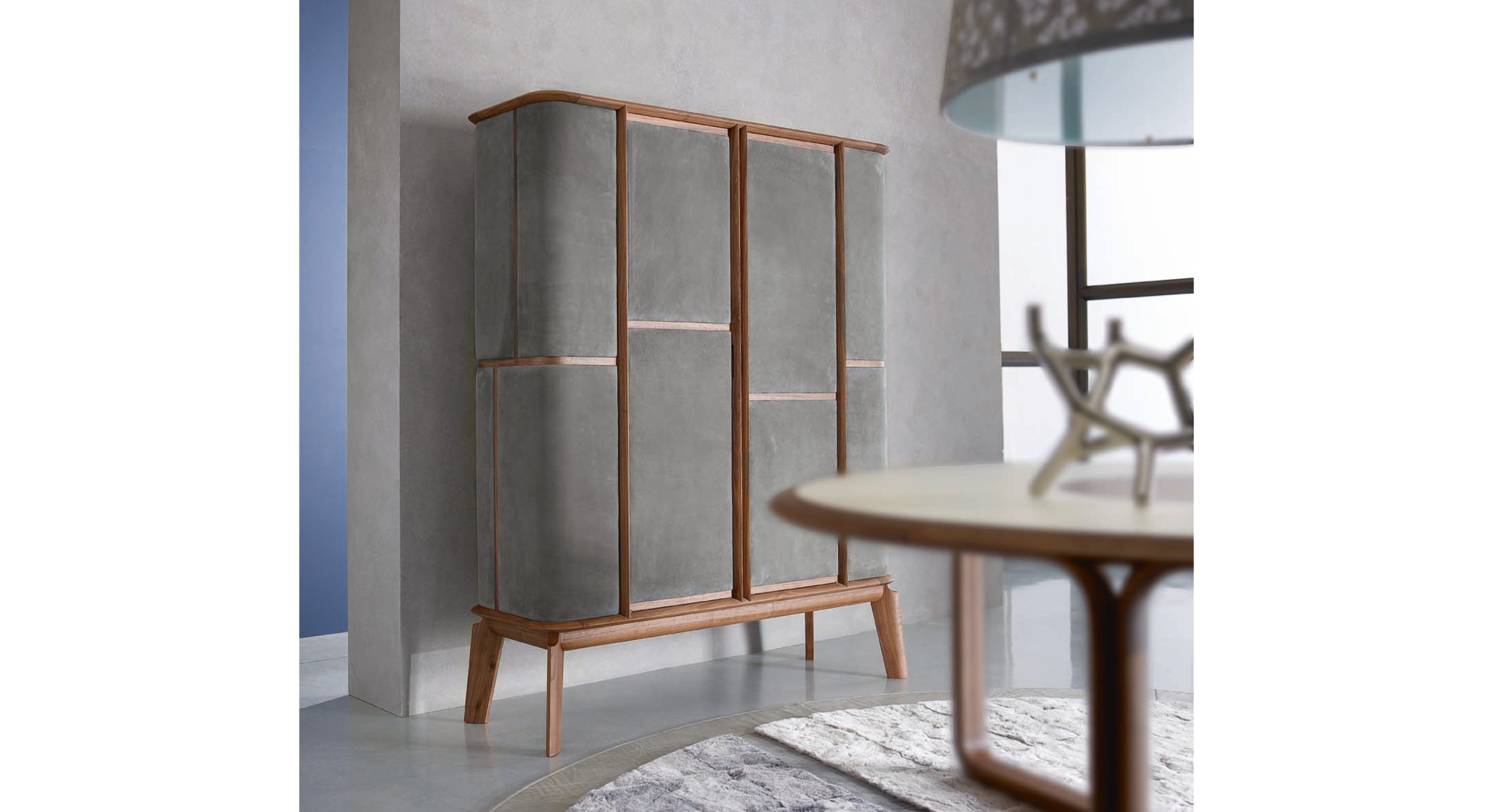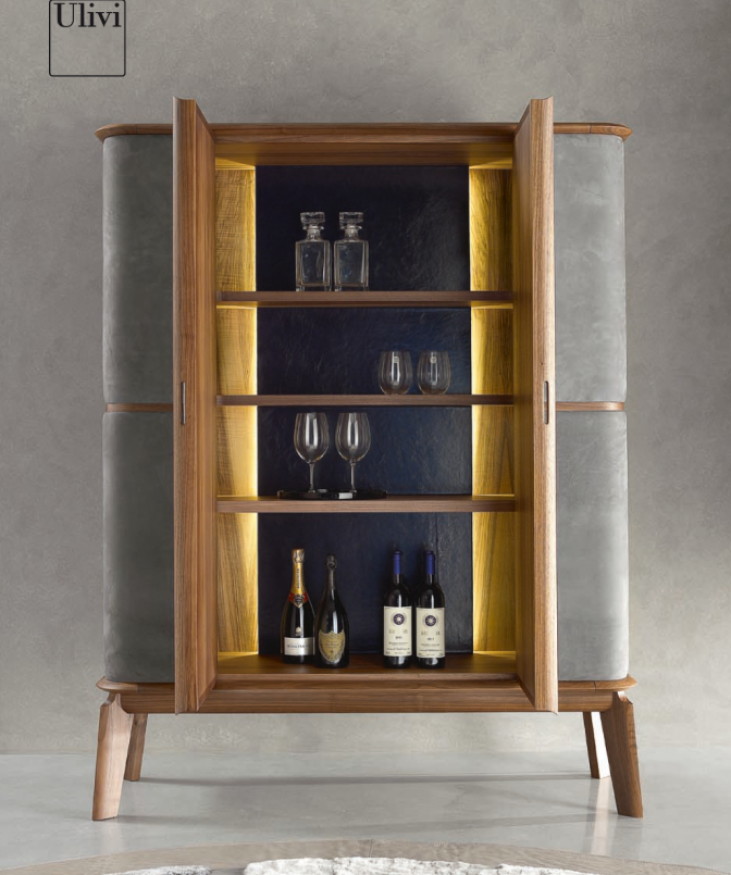 Основная конструкция : Круглая еловая фанера. Основание, ножки и деревянные рамы : Массив американского ореха. Верхушки: Еловая фанера, шпонированная американским орехом. Стандартная версия : Рамы из американского ореха. Роскошная версия : Передняя, боковые и задняя панели с кожаными вставками. Опция: внутренняя светодиодная подсветка по запросу.