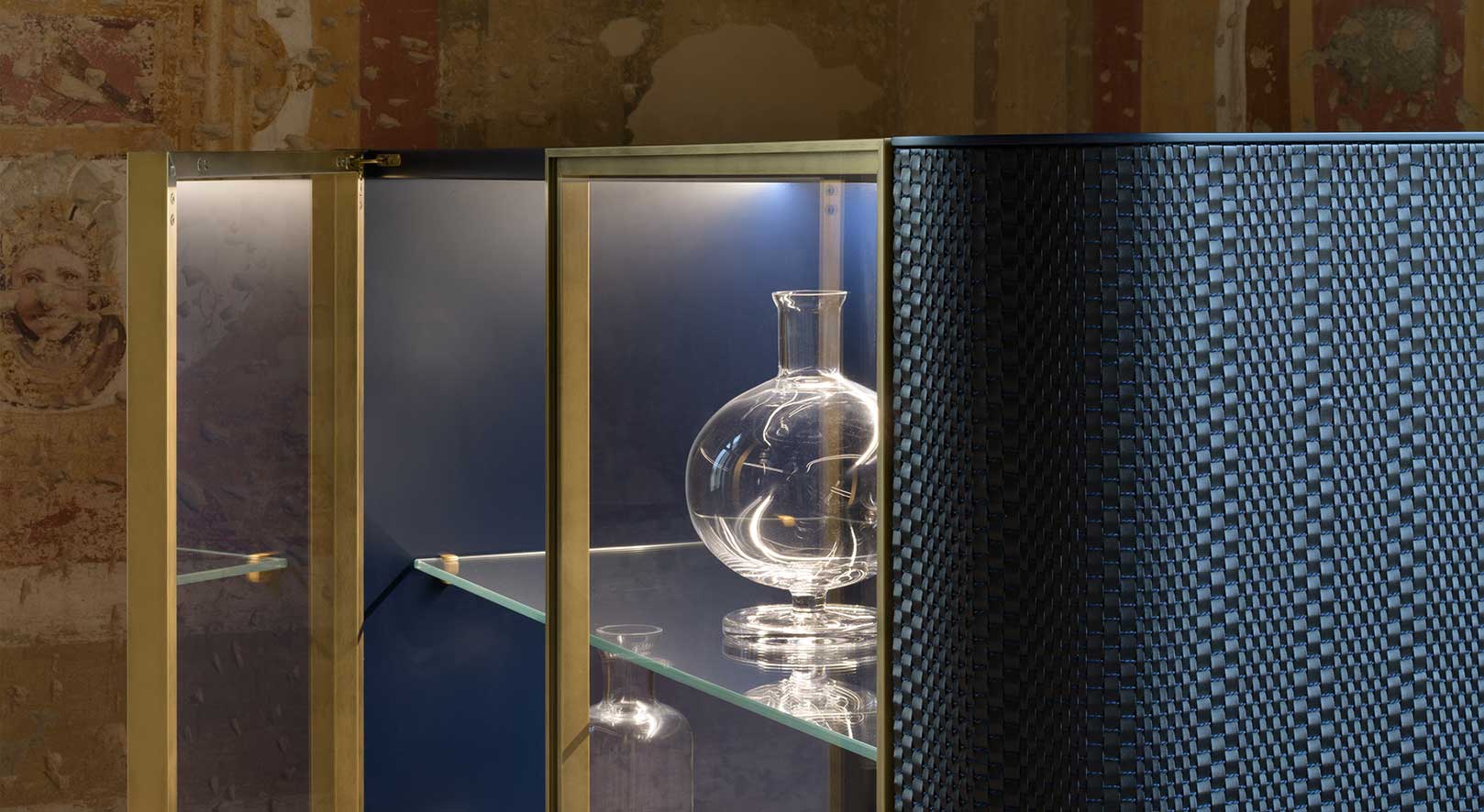 Современность и сочетание материалов являются ключевыми словами этой уникальной модели. Шкаф Memories отличается деревянной изогнутой конструкцией, искусно обтянутой специальной кожей intreccio, мягкая текстура которой придает индивидуальность и уникальность концепции.