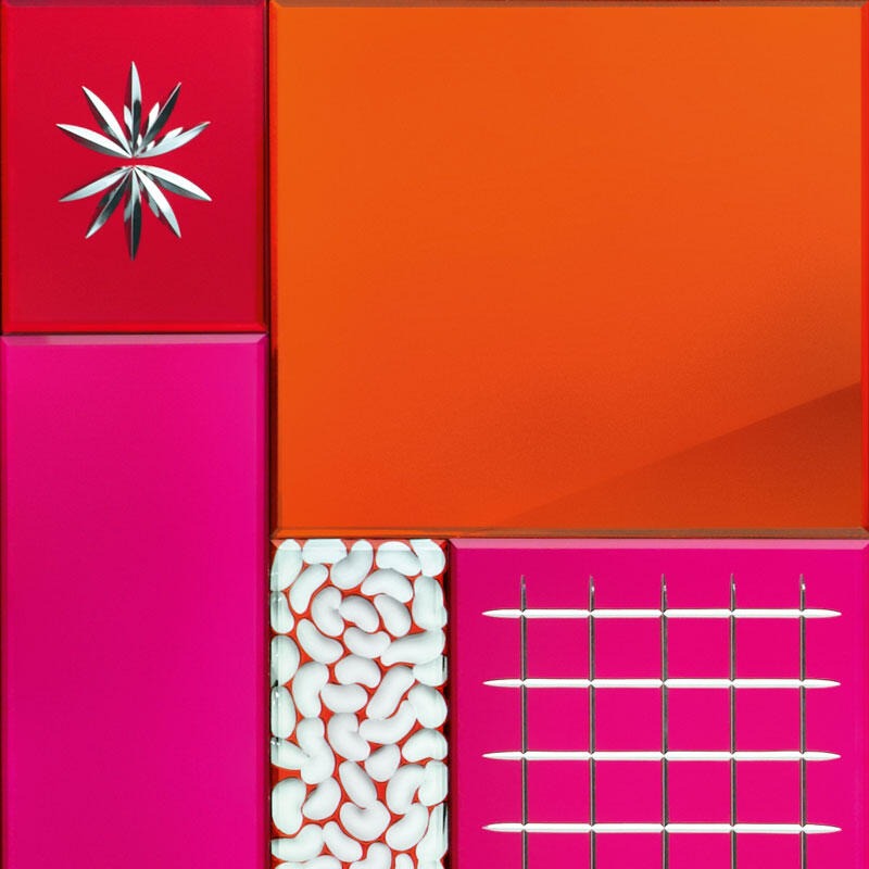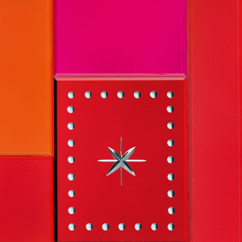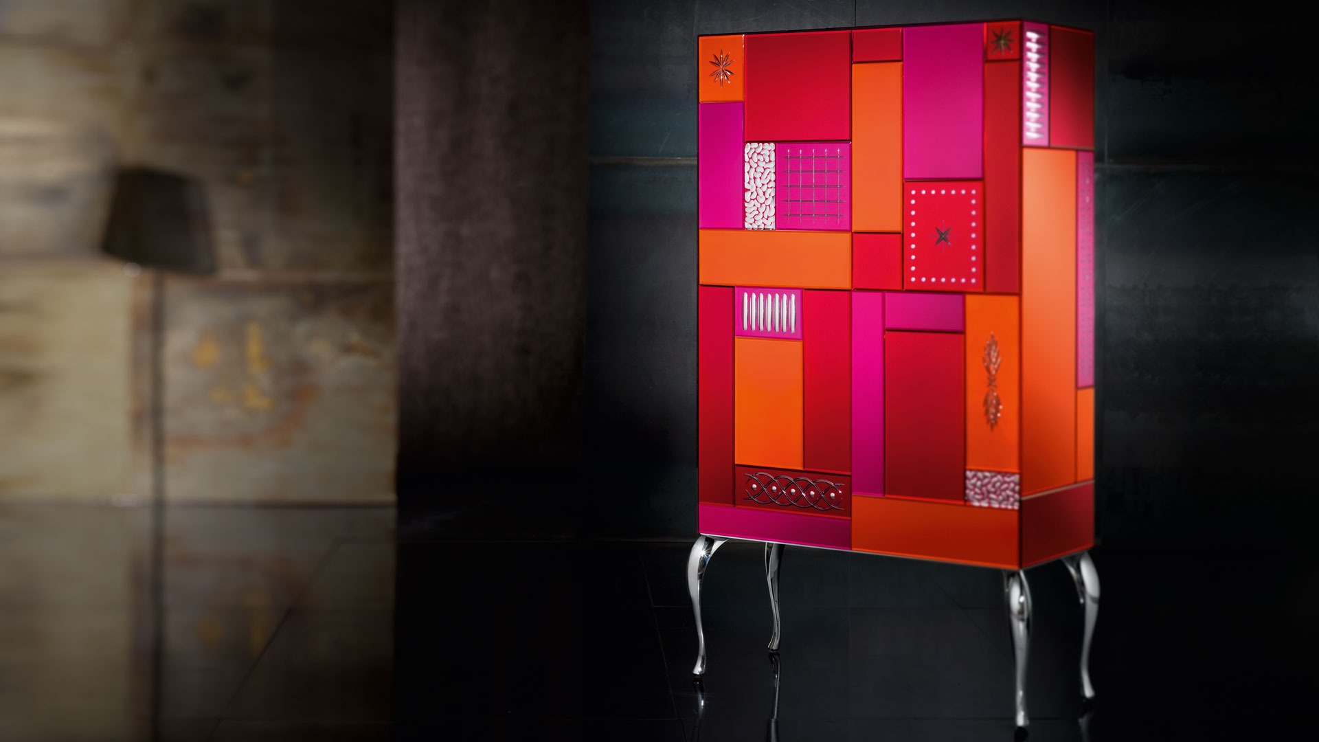 Конструкция из дерева, покрытая белым матовым лаком. Четыре фигурные ножки из литого стеклоалюминия с хромированным покрытием. Четыре дверцы с двухтактным открыванием.