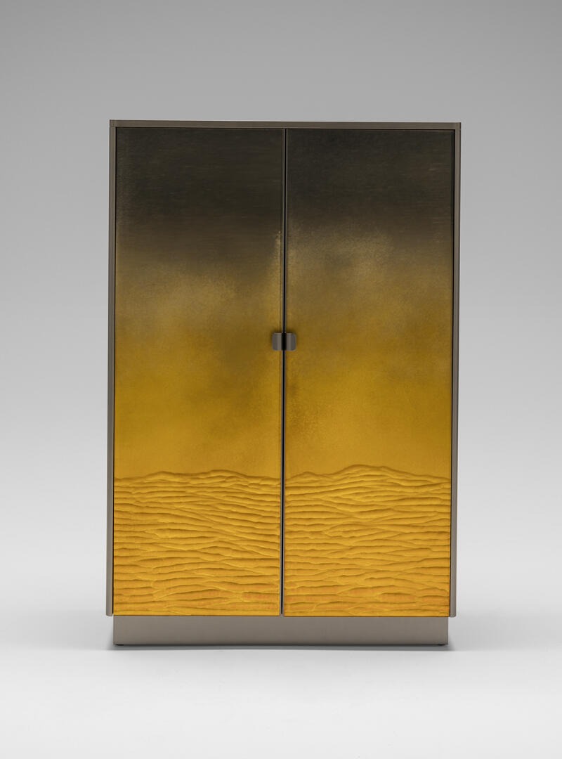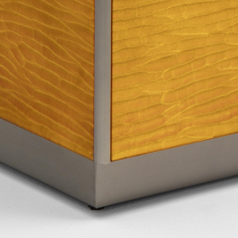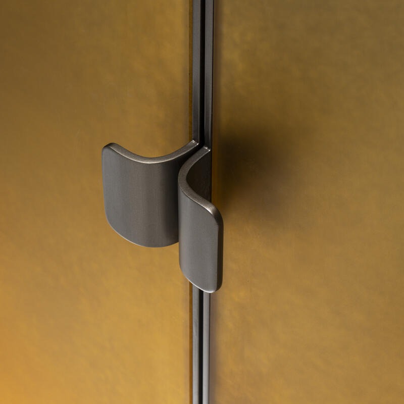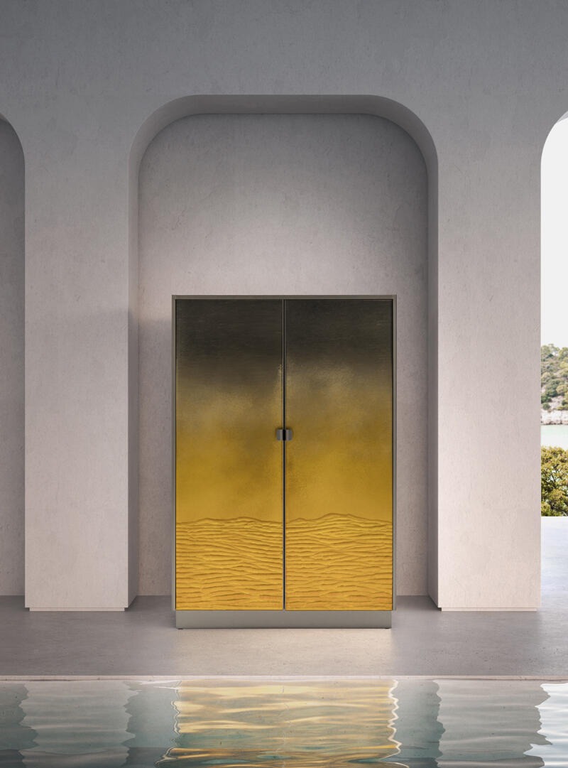 Шкаф с финишным покрытием Gargano из травленого стекла. Плинтус и внешние кромки из полированной латуни, покрытой лаком, внутренняя отделка из матового дуба.