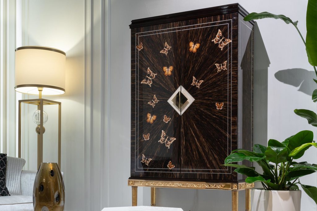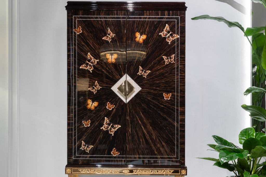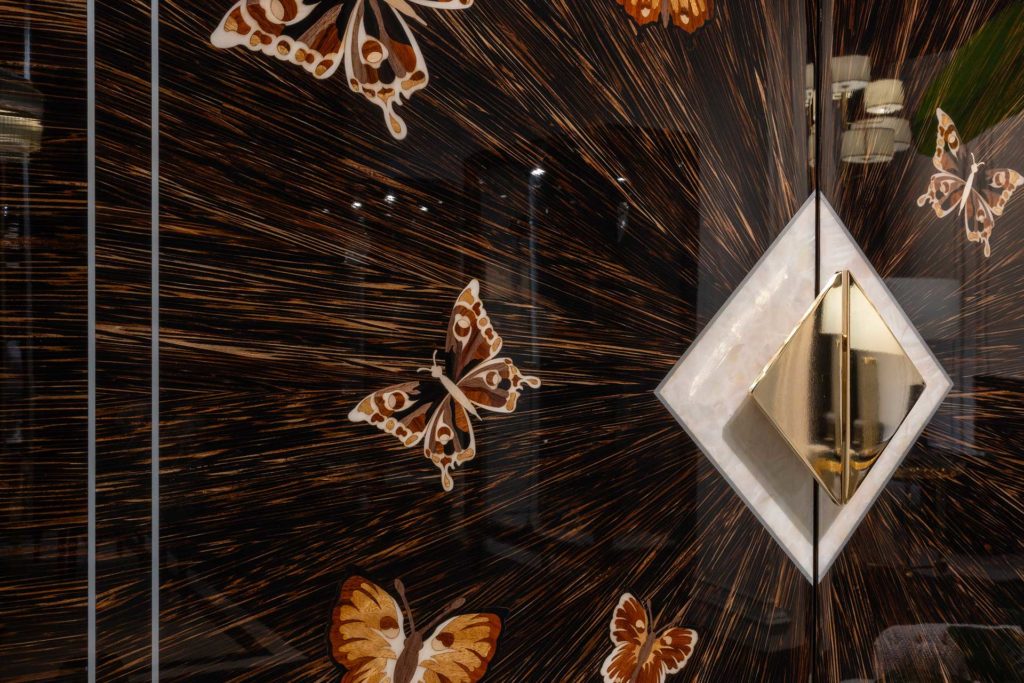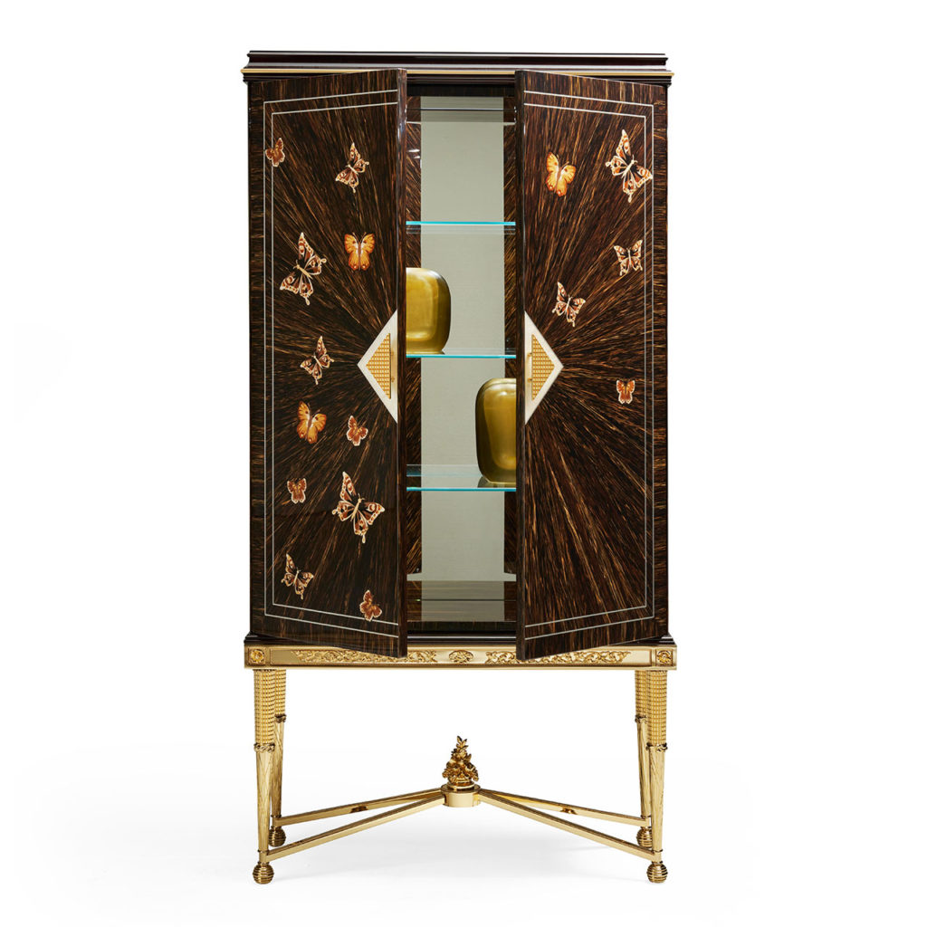 Stipo W064-это величественный предмет мебели, характеризующийся блестящей полихромией инкрустации и украшенный такими ценными материалами, как натуральный перламутр, красное дерево, Каштел, орех Каналетто, клен, отбеленный клен, желтый Pecchia, палисандр Сантос, желтый Конго, шиповник вяза, детали из фарфора, выгравированные на фоне пальмы. Основание из латуни с гравировкой золотой отделки ванной комнаты.