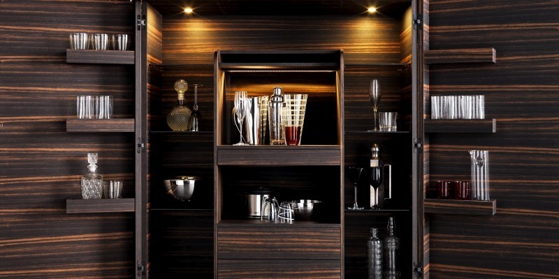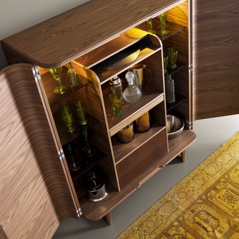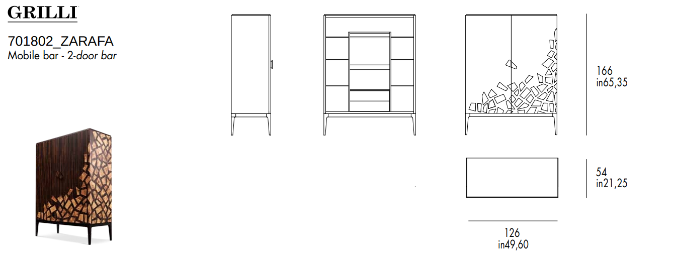 2-дверный барный шкаф, структура в сущности с декором zarafa. Интерьер оснащен бронзовыми стеклянными полками, выдвижными ящиками из кожи и освещением с прожекторами с автоматическим освещением