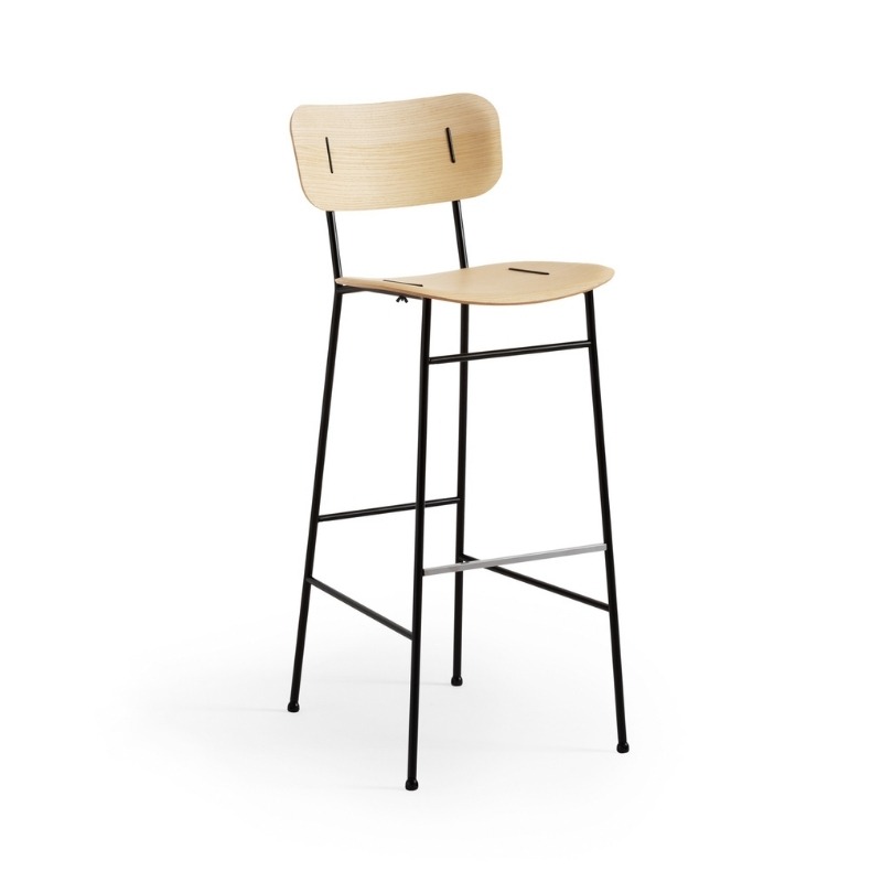 Табурет Piuma имеет металлическое основание на четырех ножках. Сиденье и спинка изготовлены из шпонированного ясеня, ореха или дуба с видимыми металлическими вставками в тон конструкции. Доступны две высоты: H65 и H75.