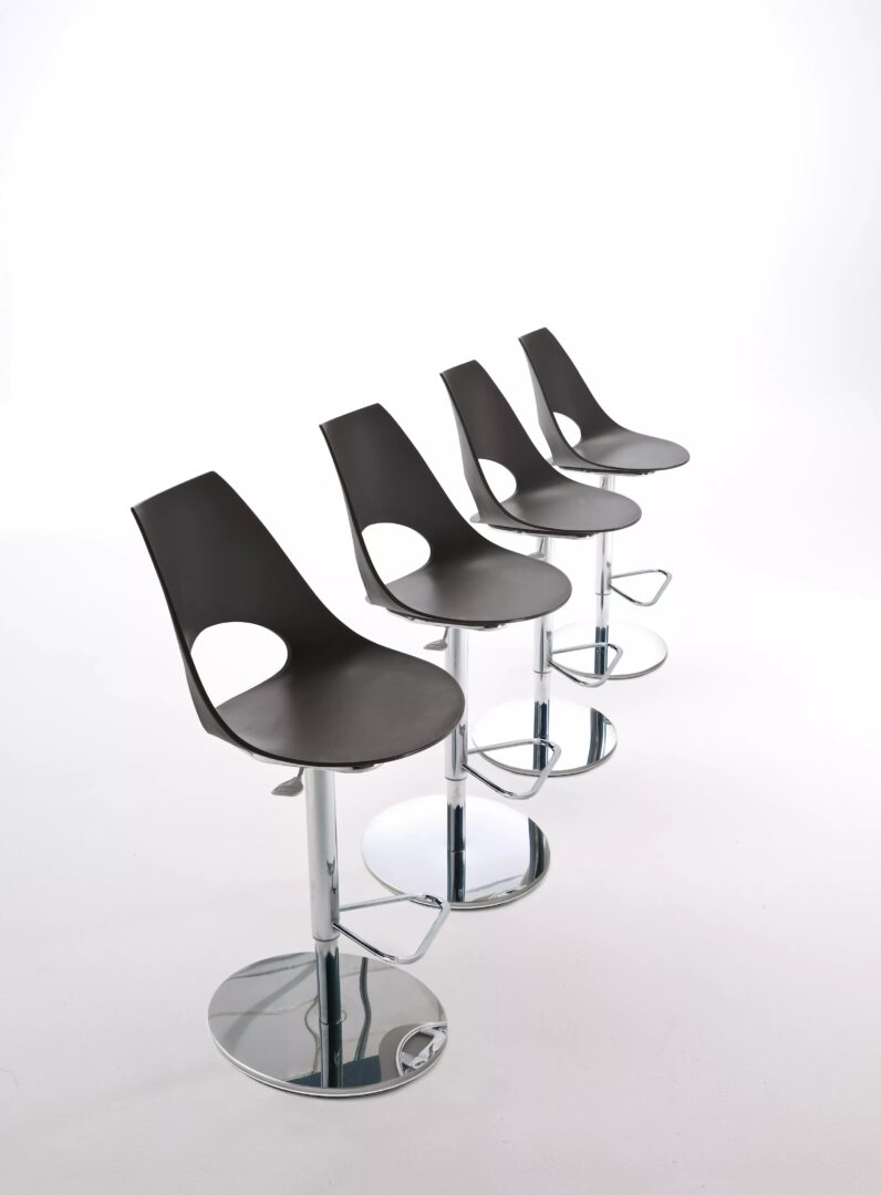 Барный стул вращающийся и регулируемый по высоте, с хромированным основанием и монолитным сидением из полипропилена.
