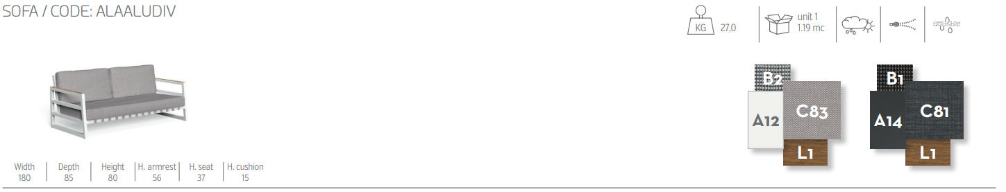 Уличный 2-местный диван Alabama Alu отличается удобным сиденьем и небольшими размерами, способными удовлетворить любые потребности в пространстве и стиле. Изысканный дизайн и традиции ремесленников характеризуют диван Alabama, являющийся результатом тщательной и сложной ручной работы. Конструкция выполнена из алюминия с порошковым покрытием, а верхняя сторона подлокотников и спинки отделана планкой из тикового дерева. Сиденье и спинка поддерживаются синтетическими эластичными ремнями, предназначенными для использования на открытом воздухе. Подушки изготовлены из съемной ткани, которую легко стирать и которая устойчива к атмосферным воздействиям. Быстросохнущая поролоновая набивка.