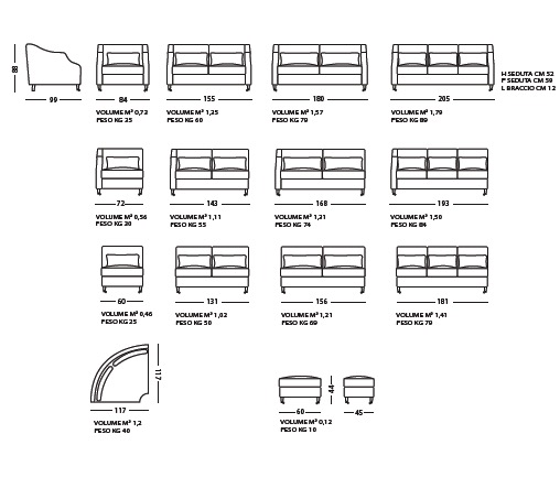 Версии: кресло, 2-местный диван, 2 с половиной места, 3-местный, пуфик и угловые версии.