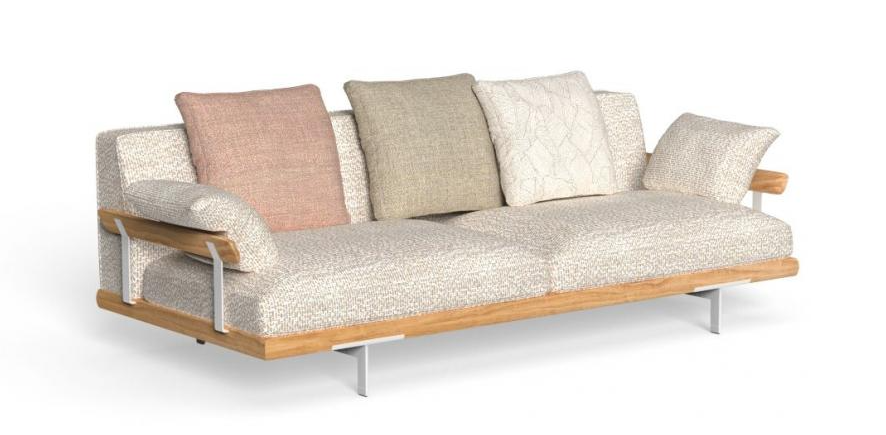 Двухместный уличный диван из коллекции Allure сочетает в себе элегантность и неформальность. Особенностью этого дивана является индивидуальная настройка подлокотников, которая, благодаря сочетанию двух доступных вариантов исполнения, придает обстановке характер и индивидуальность. Обтянутый тканью подлокотник с геометрическим рисунком обеспечивает прочность и устойчивость. Гибкая линия подлокотника из дерева и алюминия придает ему легкость и изысканность. Геометрические и линейные подушки позволяют создавать различные комбинации и сценарии.