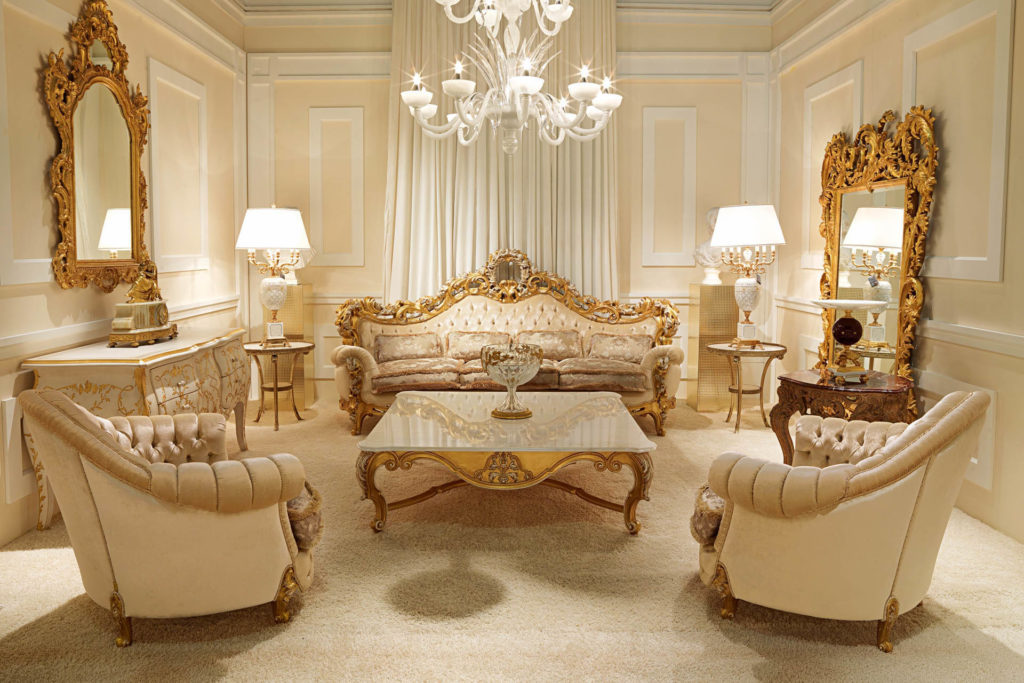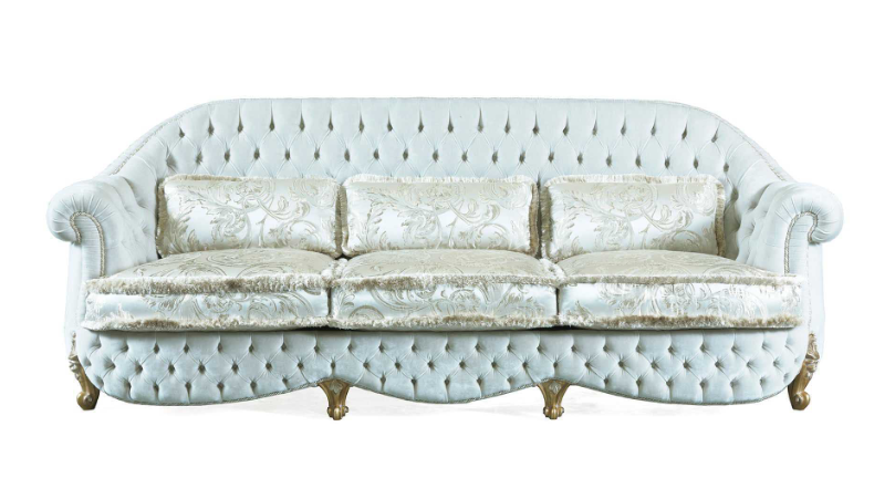 Элегантная гостиная в классическом стиле, состоящая из 3-местного дивана, 2-местного дивана и кресла с обивкой из Капитона и элегантной золотой отделкой на ножках.