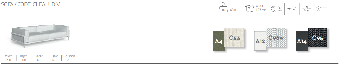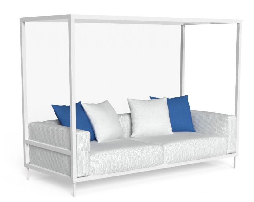 Откидная задняя шторка, закрывающая пространство между сиденьями, характерна для дивана с балдахином CleoSoft Alu. Жесткий и геометрический диван был разработан дизайнером Марко Ачербисом вместе с другими аксессуарами в более гибком стиле кресел для отдыха. Каркас выполнен из алюминия с порошковым покрытием, а подушки — из съемной ткани, которую легко стирать и которая устойчива к атмосферным воздействиям. Быстросохнущая поролоновая обивка и белая текстильная шторка.