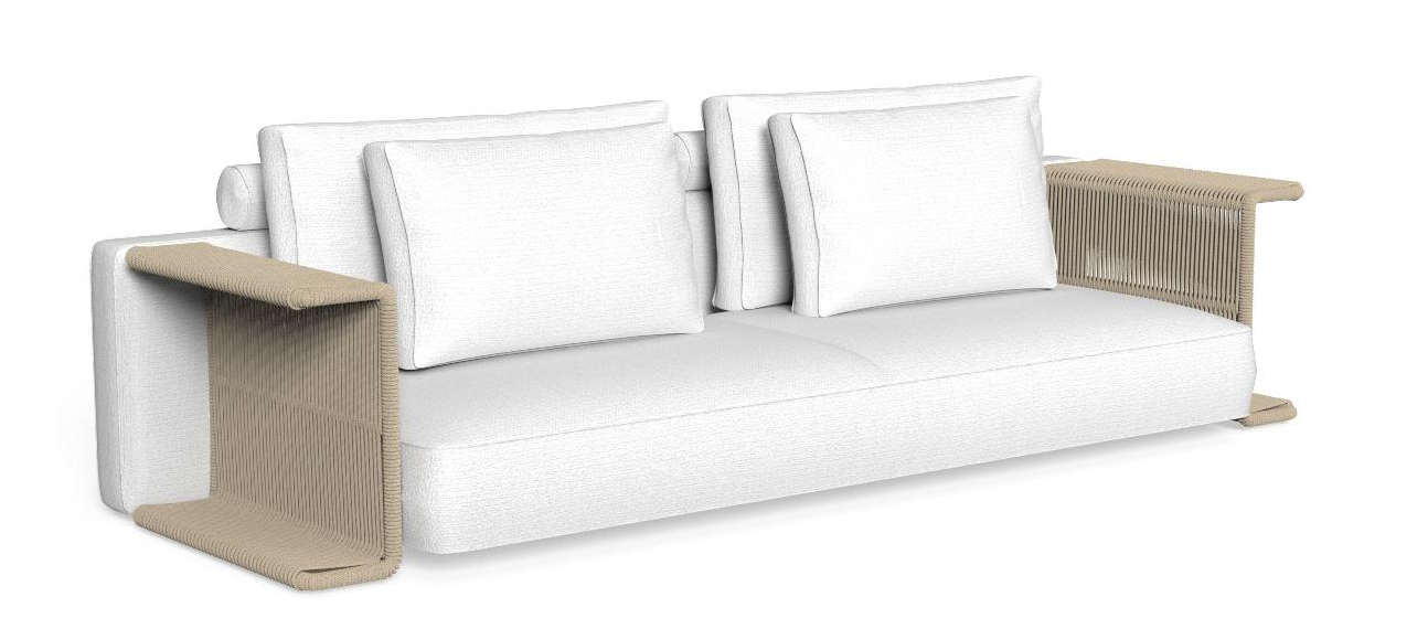 Идеальное сочетание ткани и каната является ключевым элементом дивана Cliff Decò. Спинка, изготовленная из ткани, устойчивой к атмосферным воздействиям, повторяет структуру подлокотников, полностью обтянутых синтетическим натуральным канатом. Диван, отличающийся линейными формами, идеально подойдет для оформления помещений на открытом воздухе, отражая стиль коллекции.