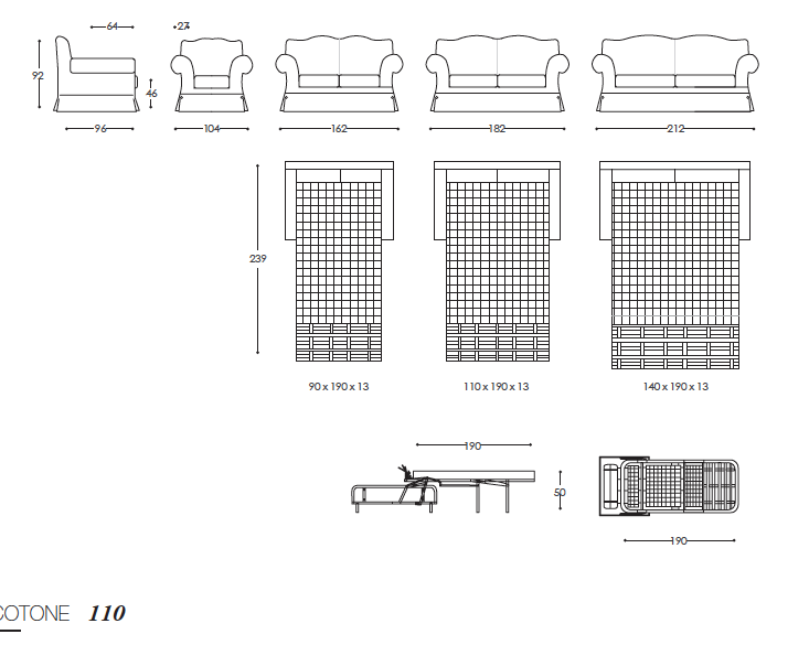Доступные варианты по посадочным местам: кресло, 2 места, 2 с половиной места и 3 места. В спальной версии матрас из полиуретана имеет высоту 13 см.
