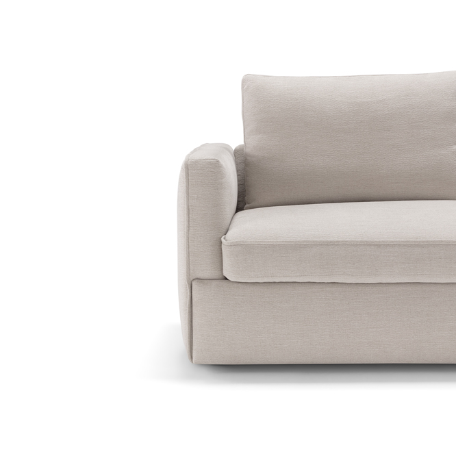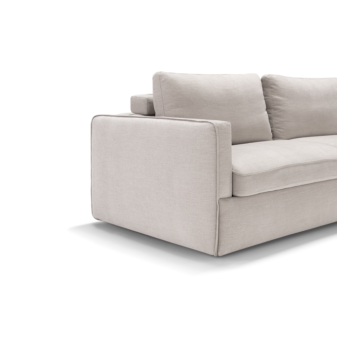 Диван Dandy отличается сбалансированным взаимопроникновением объемов, где каждая деталь продумана до мелочей. Широкая и мягкая спинка состоит из двух «летающих» подушек, которые создают ощущение невесомости, а дополнительные мягкие элементы обеспечивают устойчивость и поддержку. Квадратные подлокотники, плавно переходящие в основание, придают модели строгий, но элегантный силуэт.