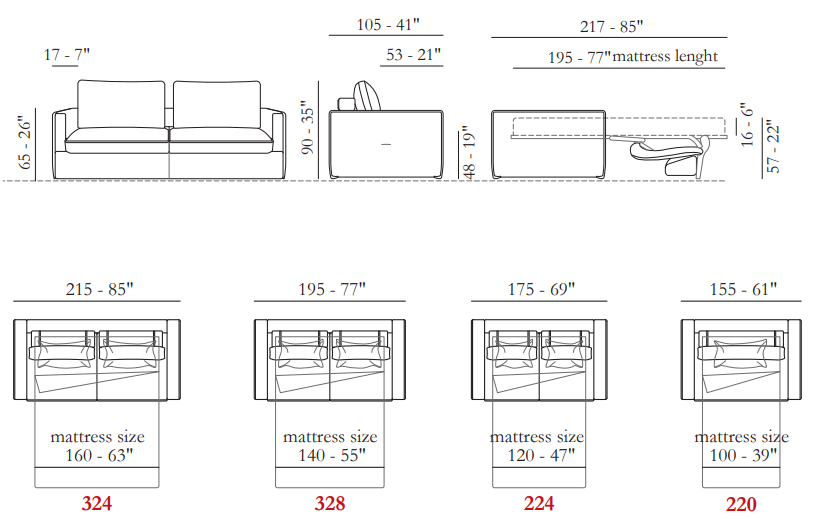 У модели предусмотрено четыре размера, включая версию «Love seat» с просторным односпальным матрасом; высота матраса — 16 см.