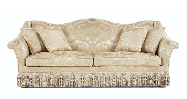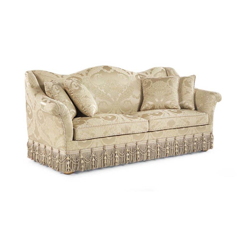 Диван в классическом стиле с тканевой обивкой. Его элегантный дизайн, пышные формы и изысканность отделки с бахромой представляют собой далекую жизнь форм и цветов, способных создать вневременную атмосферу для эксклюзивных домов в стиле 100% made in Italy.
