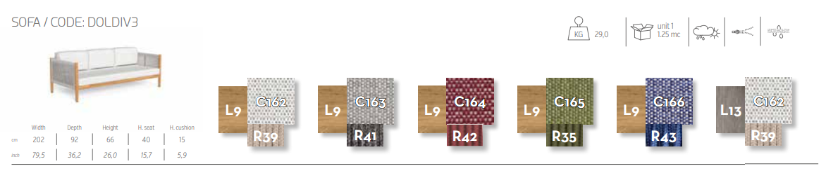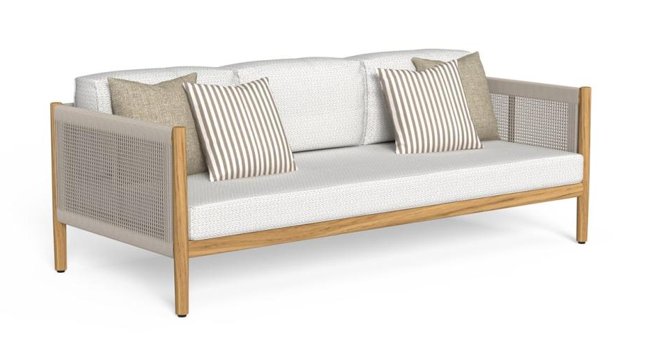 Трехместный диван Dolcevita — это дань уважения теплым летним вечерам. Каждая деталь, от плотного переплетения канатов, которыми украшены настенные перекладины и подлокотники, до отделки из тикового дерева, создана для того, чтобы напоминать о легкости самого сладкого времени года. Идеальное решение для создания зоны отдыха в саду, которая привнесет нотку свежести. Широкий выбор пастельных тонов позволяет адаптировать этот предмет мебели к любому открытому пространству.