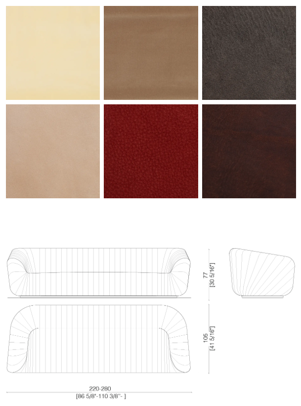 Мягкий диван с памятью, доступен в двух- или трехместном варианте, обтянут мягкой драпировкой. Снабжен ножками.
