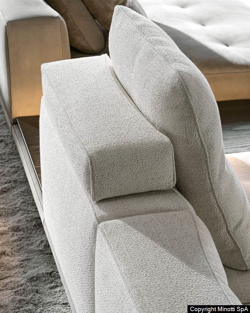 Фабрика MINOTTI сочетает вековые традиции с передовыми технологиями. Алюминиевые ножки не только украшают диван, но и обеспечивают устойчивость. Система креплений модулей позволяет создавать индивидуальные конфигурации, а бесшовная стыковка элементов подчеркивает целостность дизайна. Это мебель, где каждая деталь — часть продуманного механизма комфорта и эстетики.