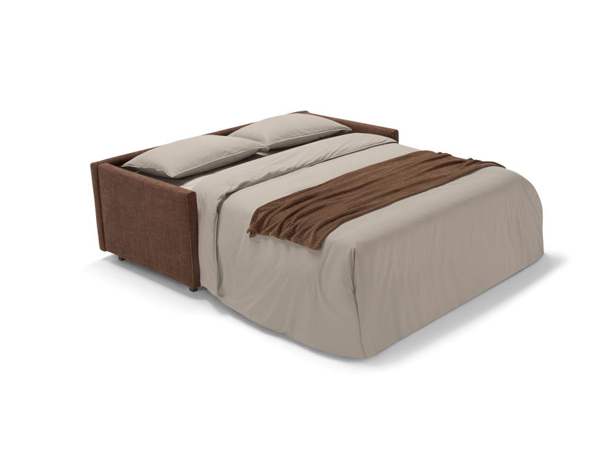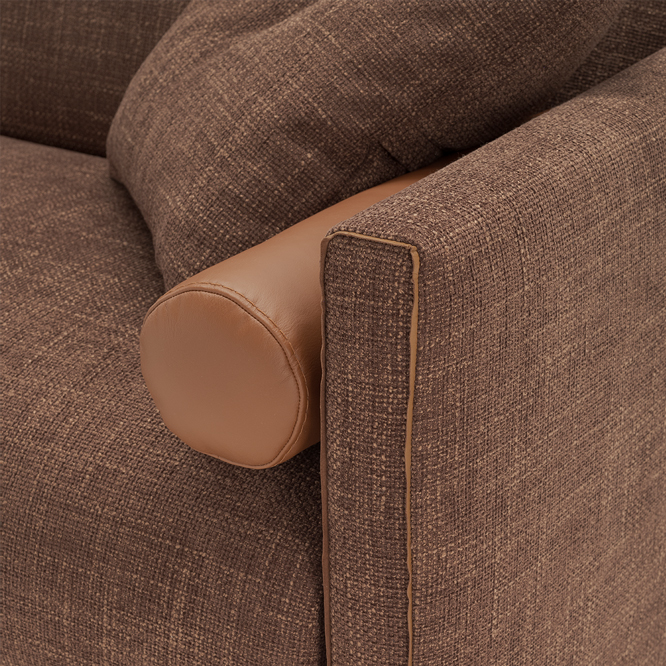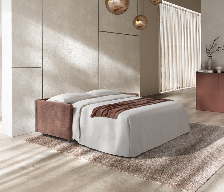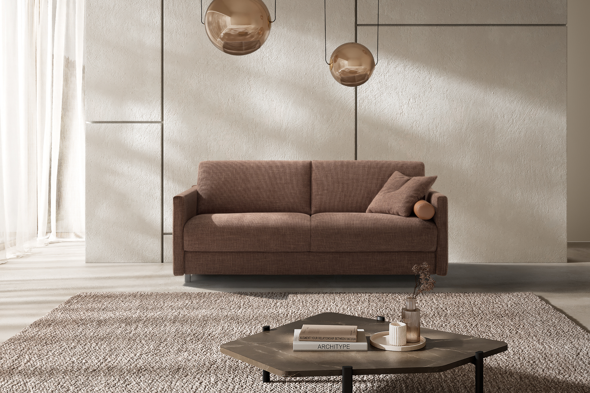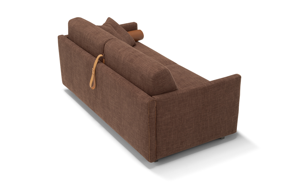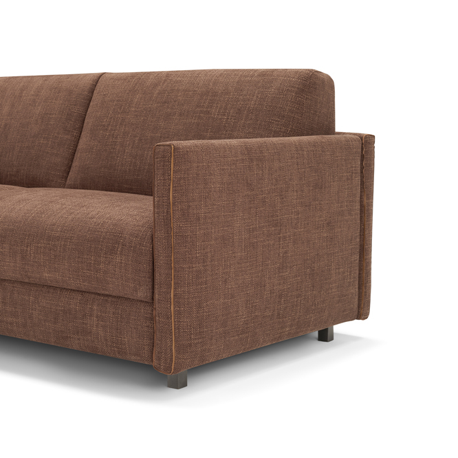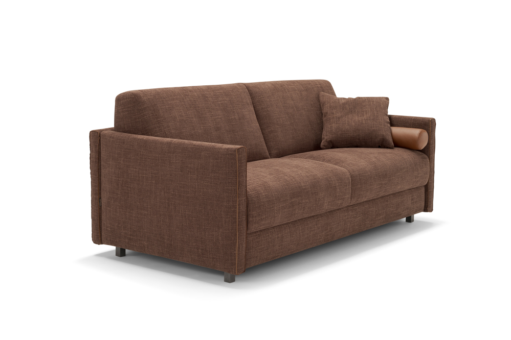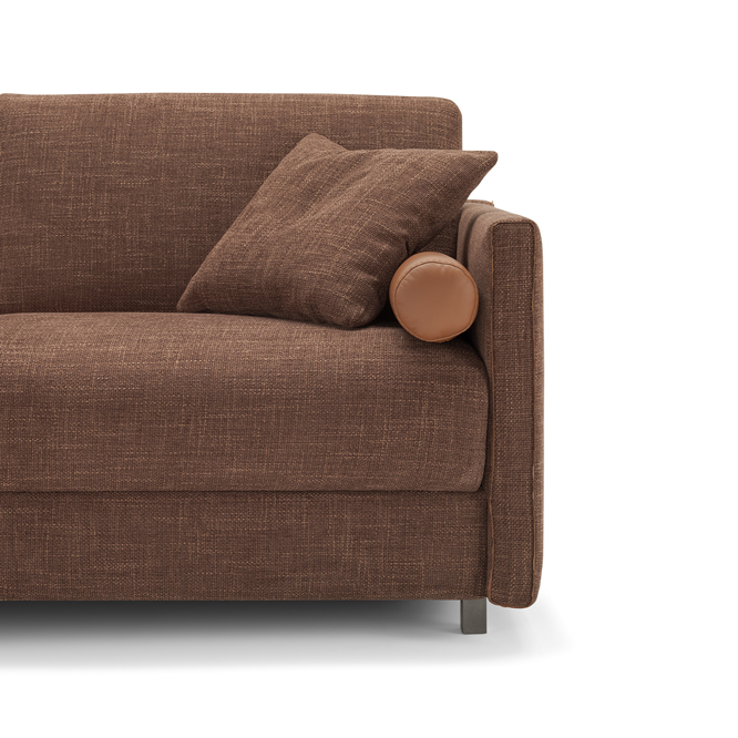 Обивка из натуральной ткани в теплых земляных оттенках дополнена эксклюзивными кожаными вставками (5 цветов на выбор). Диван-кровать оснащен деревянной решеткой для комфортного сна, а узкие подлокотники минимизируют занимаемую площадь.