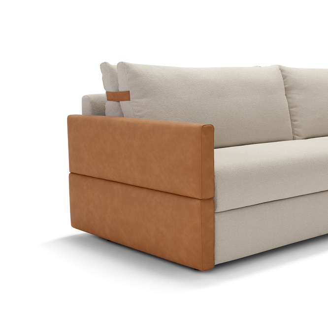 Eudora — это не только элегантный диван, но и удобная кровать, которая раскладывается одним движением. Достаточно снять подушки с плеч и активировать встроенный механизм откидывания — и перед вами раскроется просторный матрас. Горизонтальное отверстие и поперечно ориентированная кровать делают его идеальным решением для гостевых комнат или небольших пространств, где важна многофункциональность.