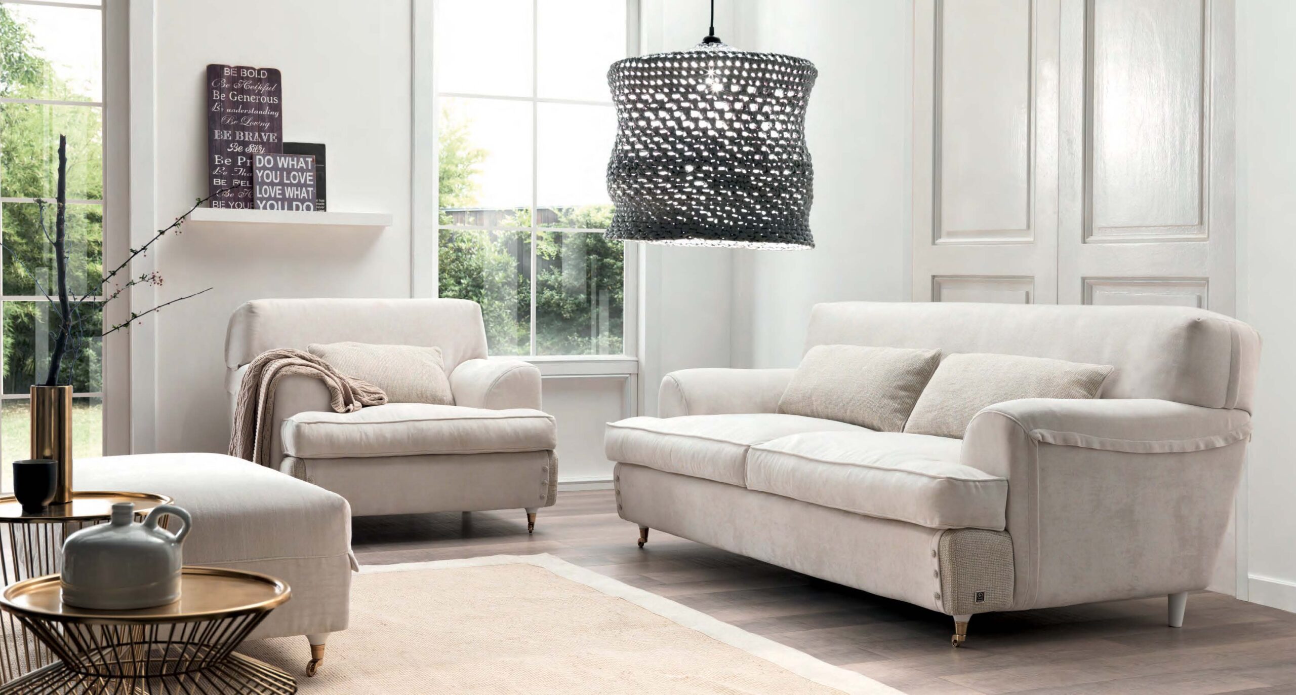 Версии: пуф, кресло, 2 места, 2 места и половина, 3 места и 3 с половиной места. Структура: дерево и его производные, эластичные ремни скрещенные с высокой прочностью. Обивка: пенополиуретан по высоте и качеству дифференцированные, полиэфирные волокна. По требованию, вы можете настроить отступы с связанные с этим дополнительные расходы. Характеристики: перья в стандартной комплектации; съемный; открытые ноги в отделке, предусмотренной в каталоге (передние ножки с латунным колесом)