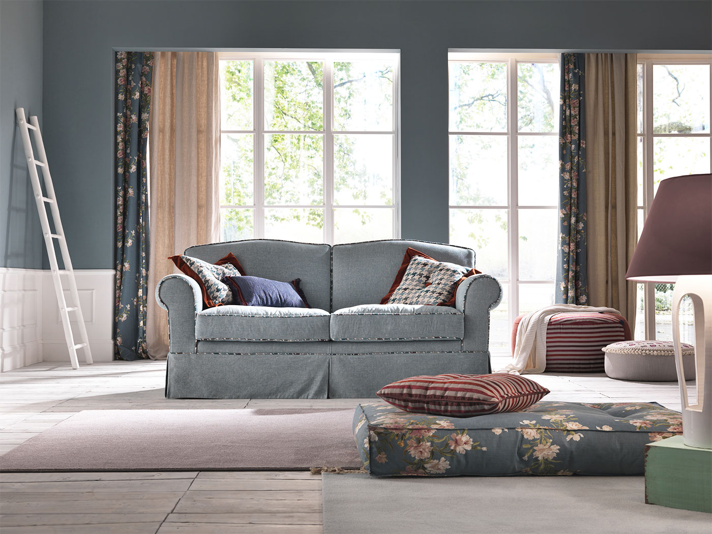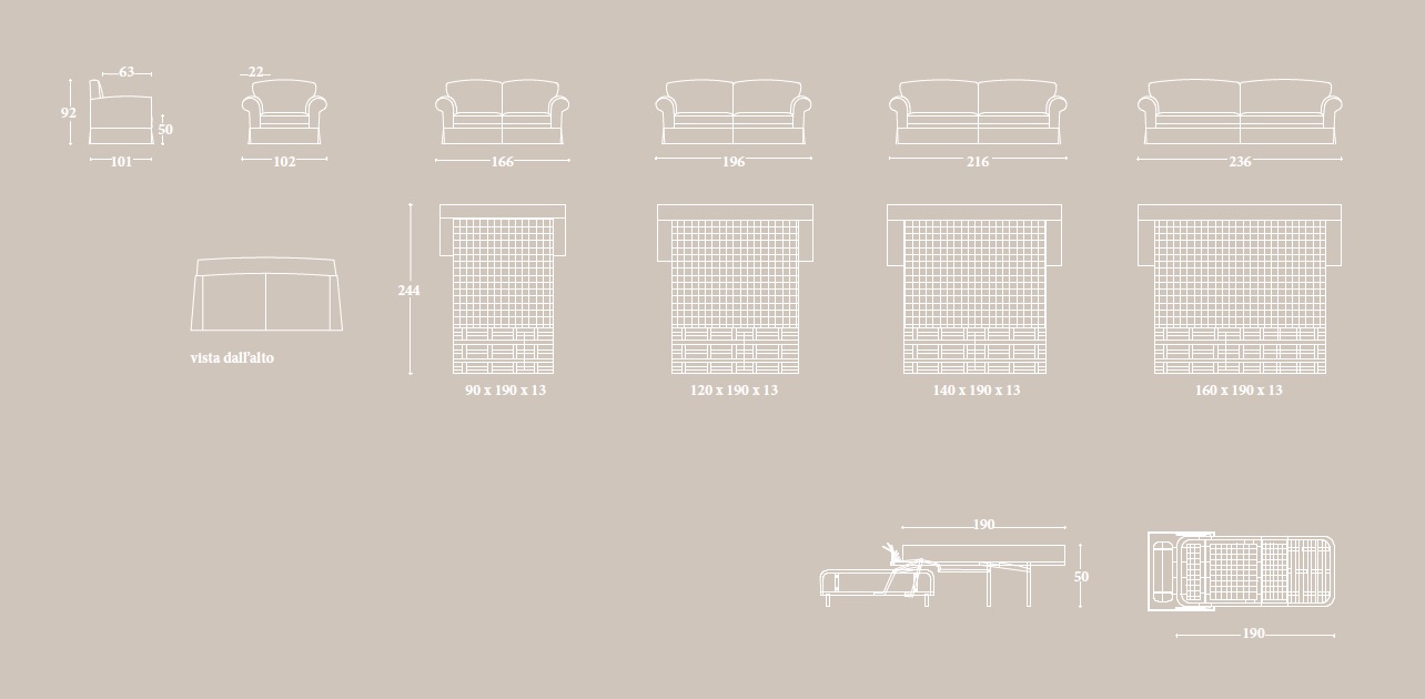 Версии: кресло, 2 места, 2 с половиной места, 3 места и 3 с половиной места. 2-местный, 2-местный, 3-местный и 3-местный диван доступен в версии кровати с электросварной сеткой и матрасом из полиуретанового волокна h. 13 cm. Структура: дерево и его производные, высокопрочные перекрестные эластичные ремни. В версиях без кровати опора сиденья может поставляться с винтовыми пружинами за дополнительную плату. Набивка: пенополиуретан с различными размерами и качеством, полиэфирные волокна. Особенности: полностью съемный; с оборками и профилями с окантовкой в стандартной комплектации.