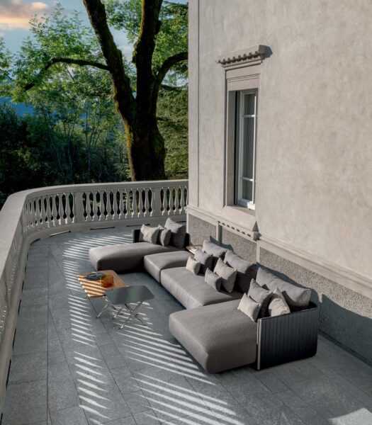Модульный диван из коллекции George представляет собой ведущий продукт новой коллекции Talenti garden. Легкость линий и комфорт сидений компенсируют прочность и долговечность стоек конструкции из нержавеющей стали: они остаются видимыми за мягкими синтетическими канатами, которыми покрыта спинка. Несколько комбинаций, предлагаемых модульным диваном George, тщательно подобранные ткани, подушки со съемными чехлами, устойчивыми к атмосферным воздействиям, делают этот диван идеальным изделием для украшения вашего открытого пространства.